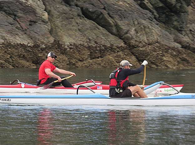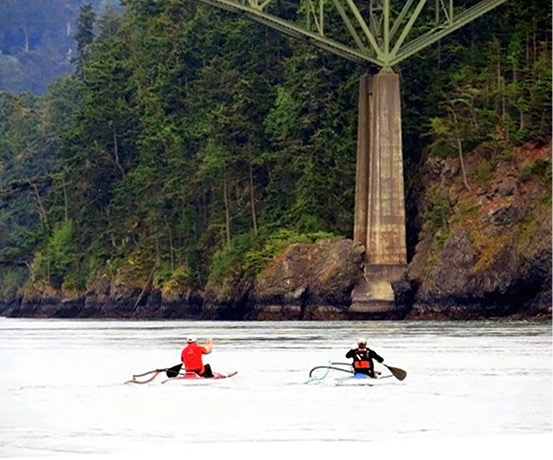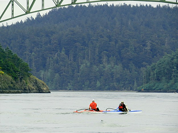 Around 1600 hrs, Al started checking the current tables to see if the current had slowed enough for us to make it through a little early. By 1645 hrs, the current was down to 2.1 knots, so we decided to go for it. The ride was a bit squirrelly, but tolerable. I was feeling pretty brave until I spotted a couple of guys paddling through the Pass on outrigger canoes.