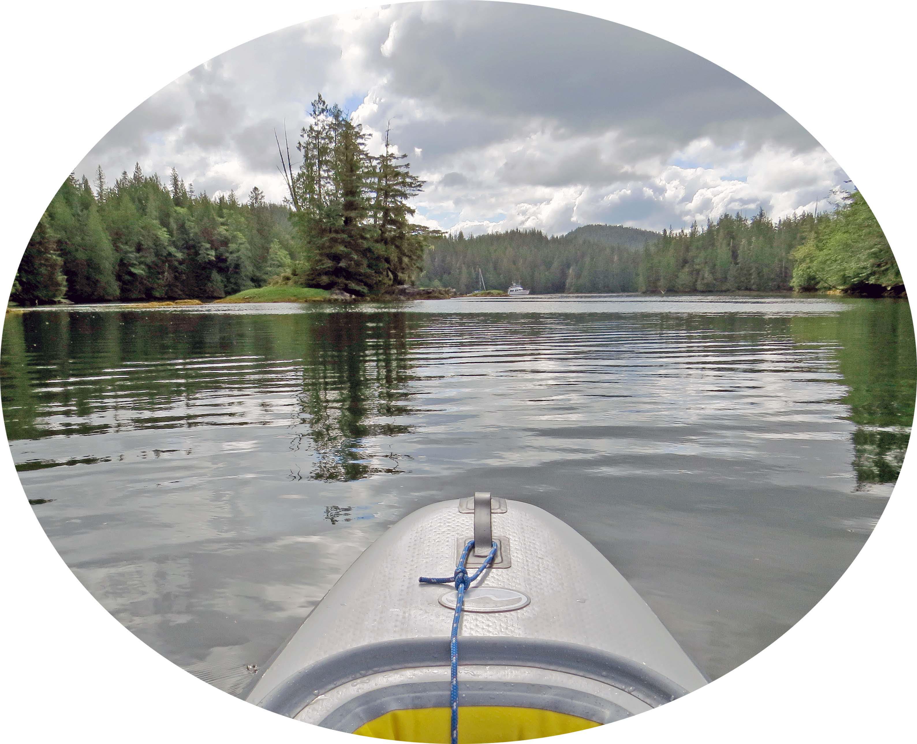 This morning the sea was like glass — perfect for kayaking. I paddled around all the little islets in the anchorage, and down to the south entrance to the bay. I looked at my watch and found I’d only been paddling for an hour. With plenty of time to spare and the sea so benign, I was lured out into Fitz Hugh Sound. I paddled and paddled, hugging the shoreline, looking for the north entrance to the anchorage. The current was running pretty strong against me, so it was pretty slow going. I came to point after point, but no opening. I didn’t think I’d paddled that far south before heading out into Fitz Hugh. But, I had been paddling with the current on the way south. Now, I was bucking it. It makes a big difference. On I went, my glasses fogging from my heavy breathing. Then, I saw the yellow fishing boundary triangle at the north entrance to the bay. I’d made it, finally. I headed in and soon caught sight of Jubilación. She never looked better.