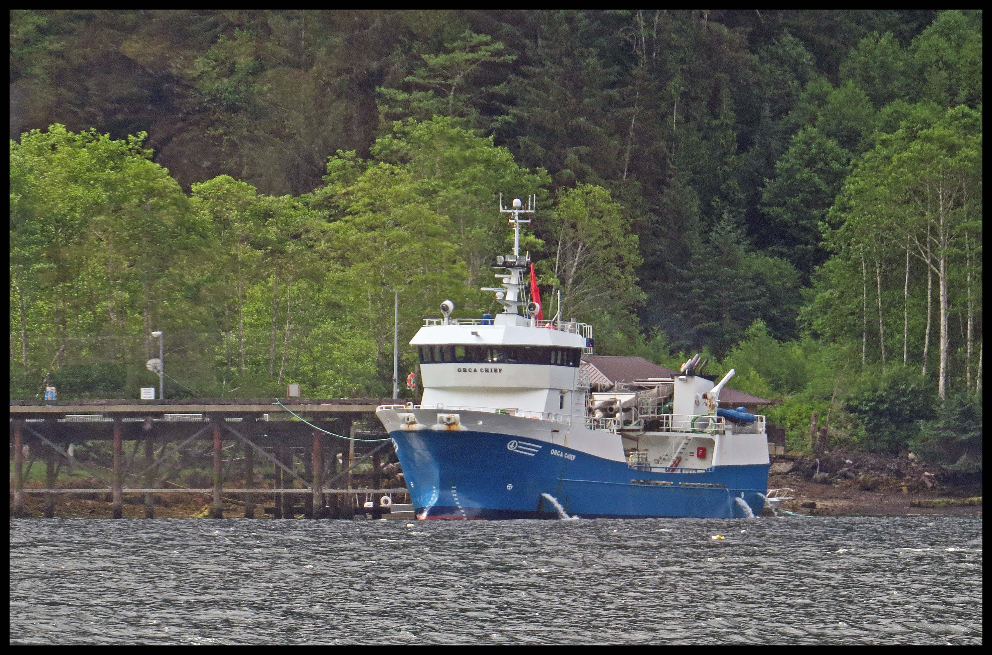 The Orca Chief that services the Ocean Falls Hatchery had followed us all the way.