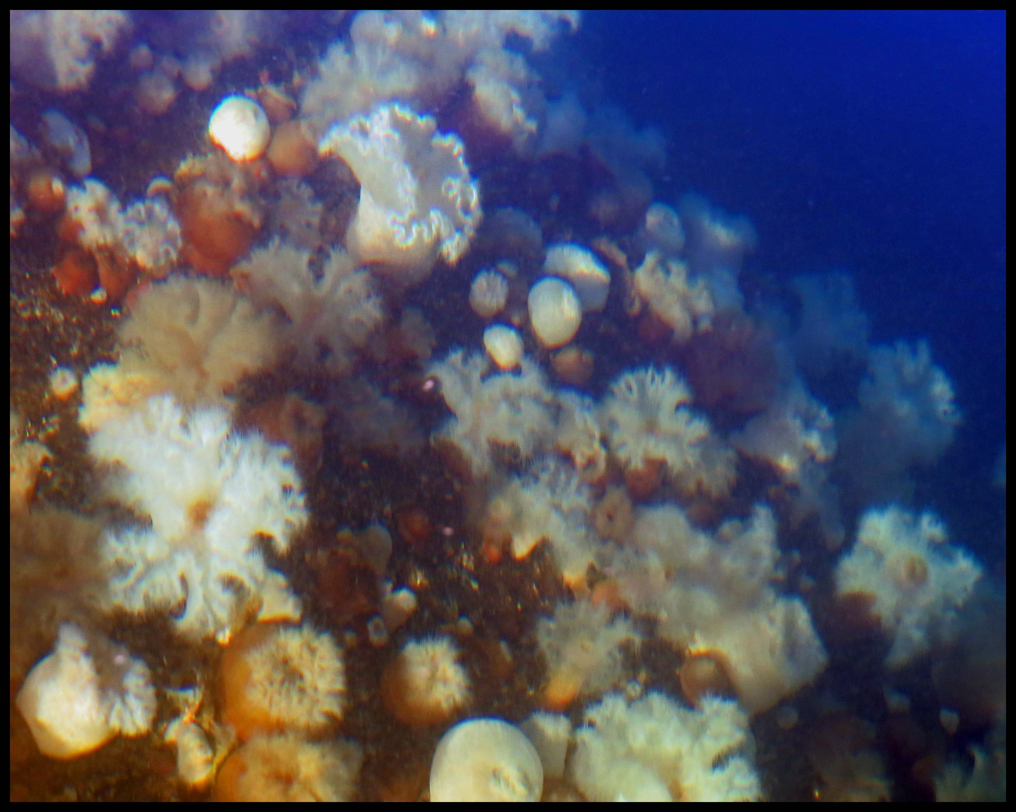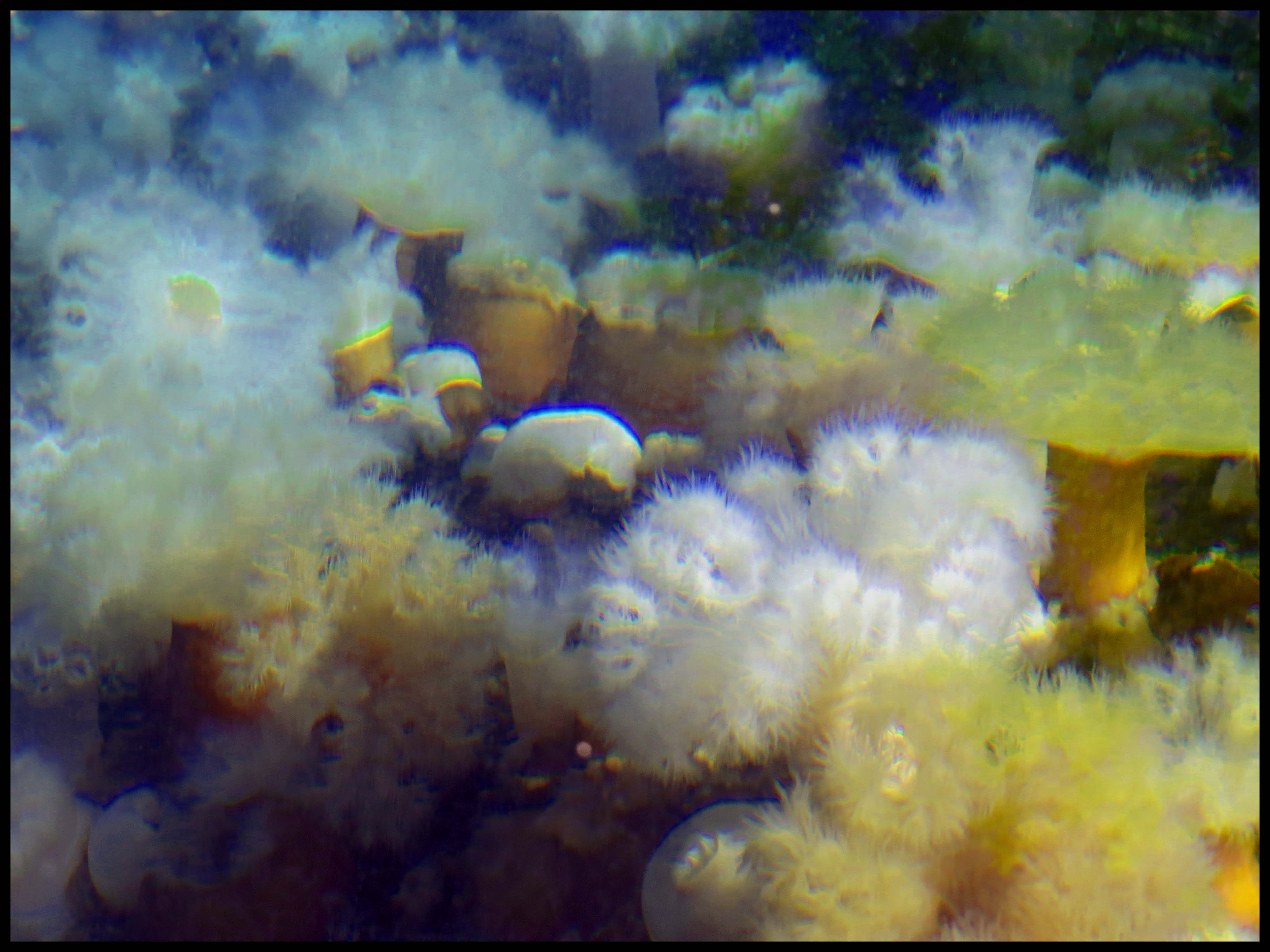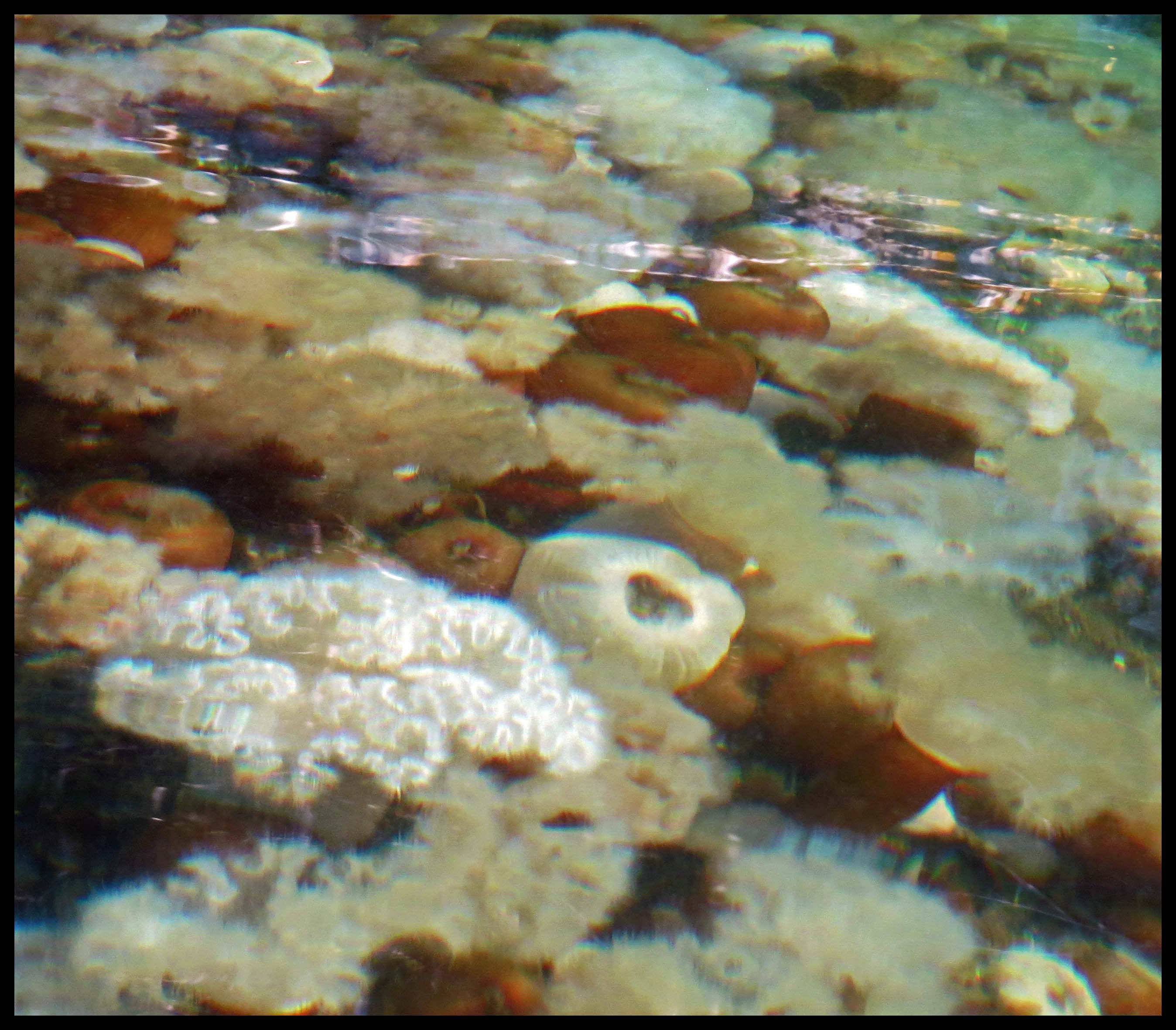 Just inside the entrance, I spotted a huge rounded rock, about twice the size of a couple of Volkwagens, that was just a foot below the surface of the water. It was covered with anemones.