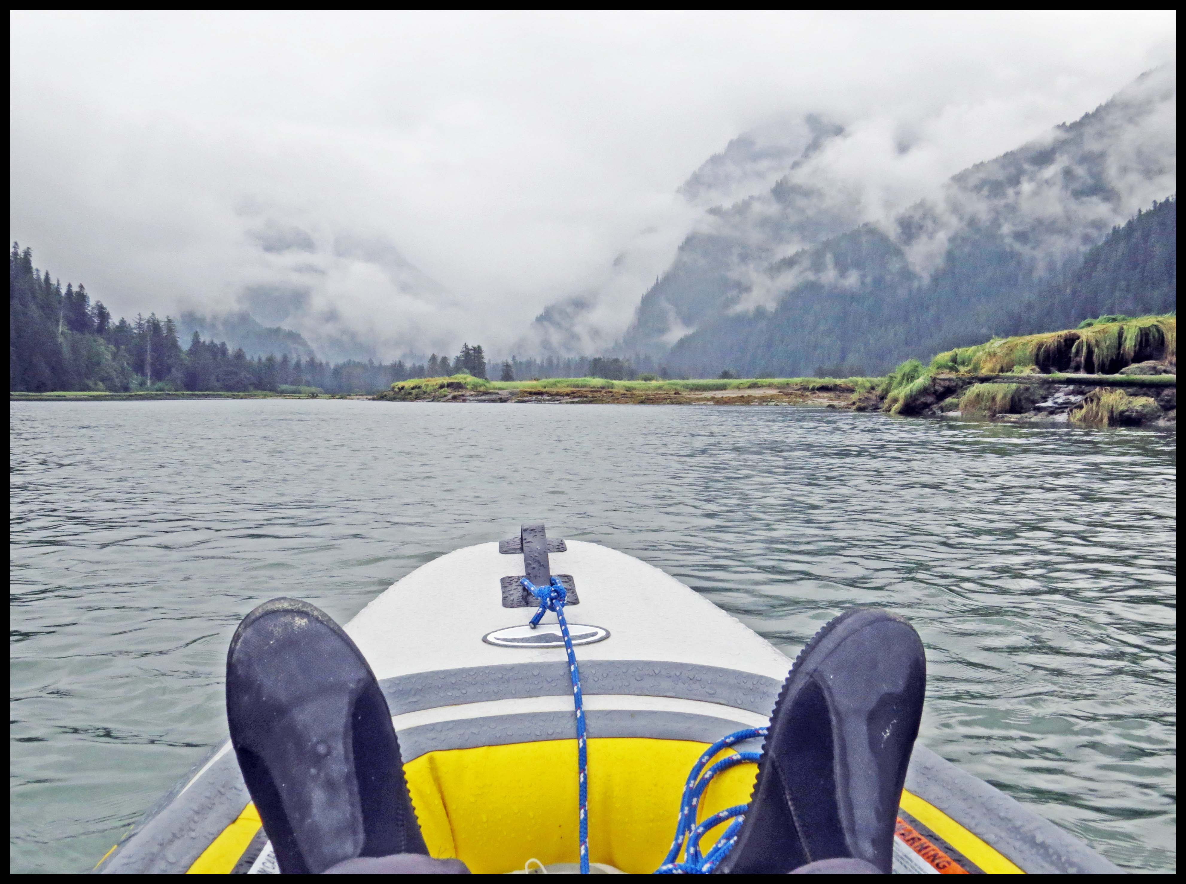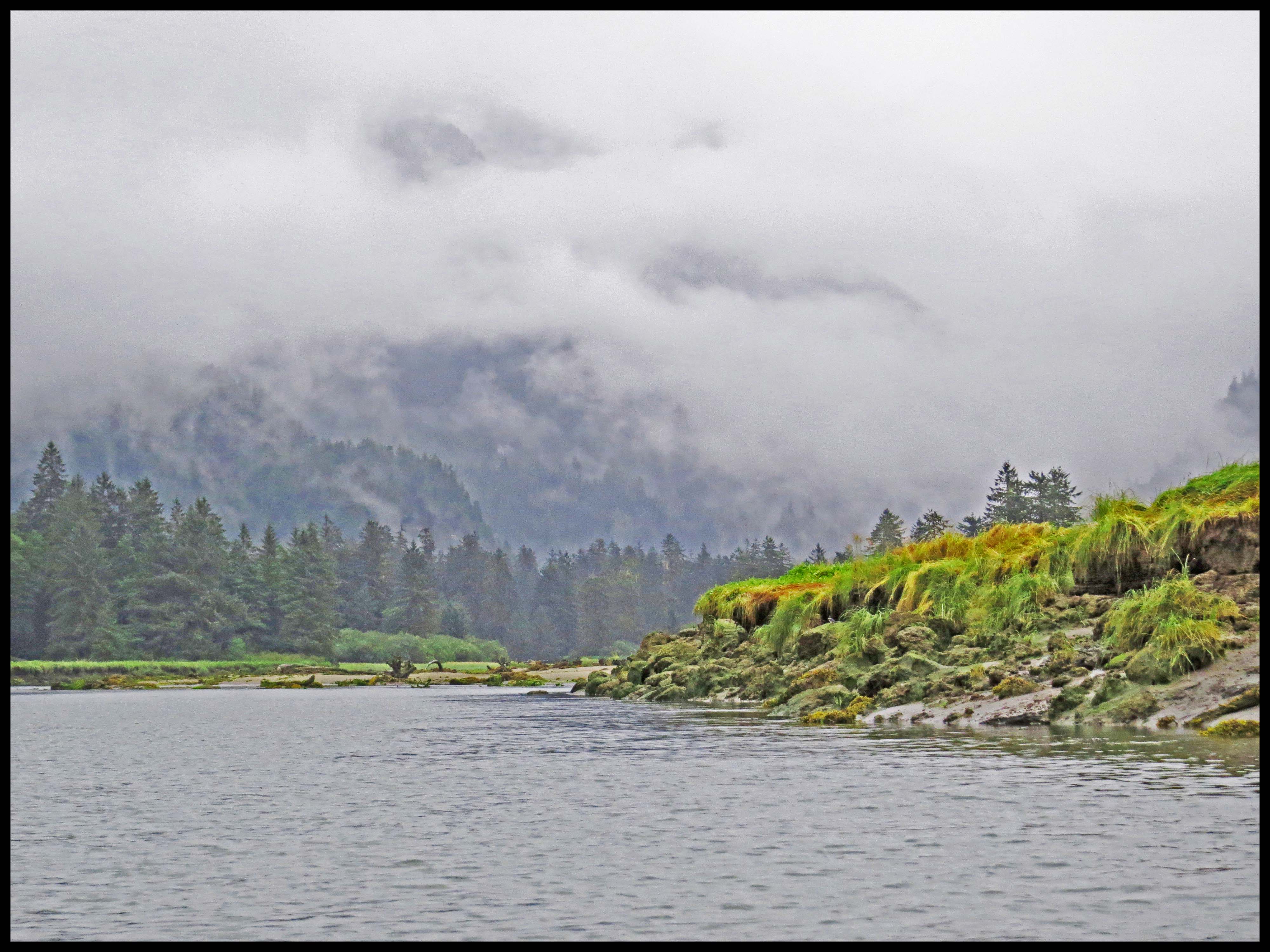 Finally, around 1100 hrs, it started raining, which cleared up the fog. I can handle rain. So, I headed up river. By now the tide was too low to get very far.