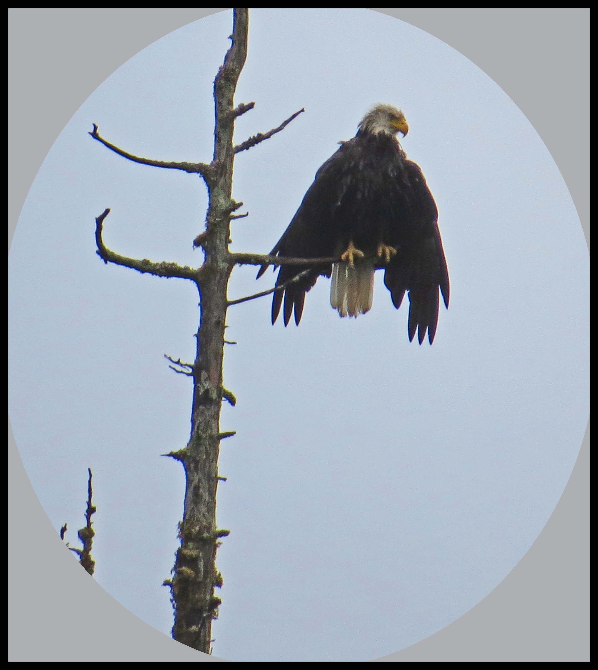 I spent the day watching the rain, looking for bears and not finding any, and doing indoor projects like working on my blog and photo editing. I didn’t see one bear, even though there were lots of salmon jumping near the falls. Very disappointing. The eagles aren’t even flying, but just sit in the tops of trees, looking miserable, trying to dry their wings in the pouring rain. Definitely not happy campers.