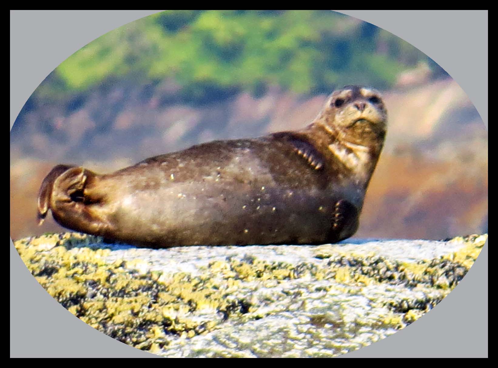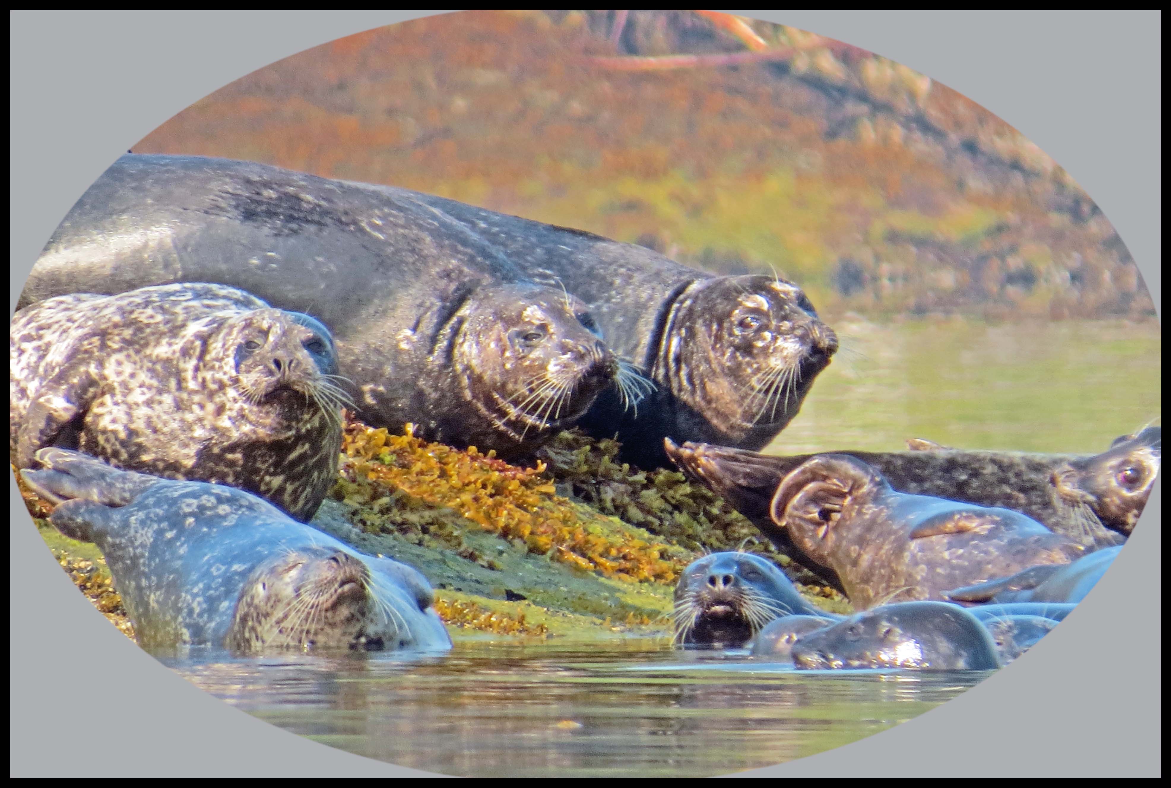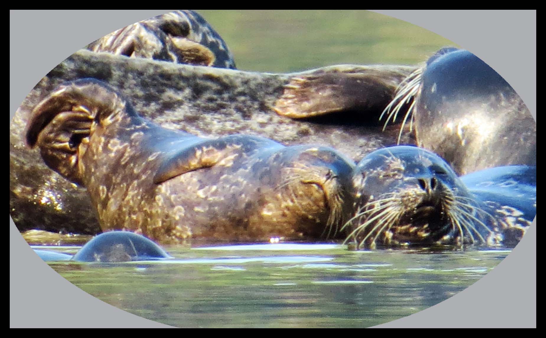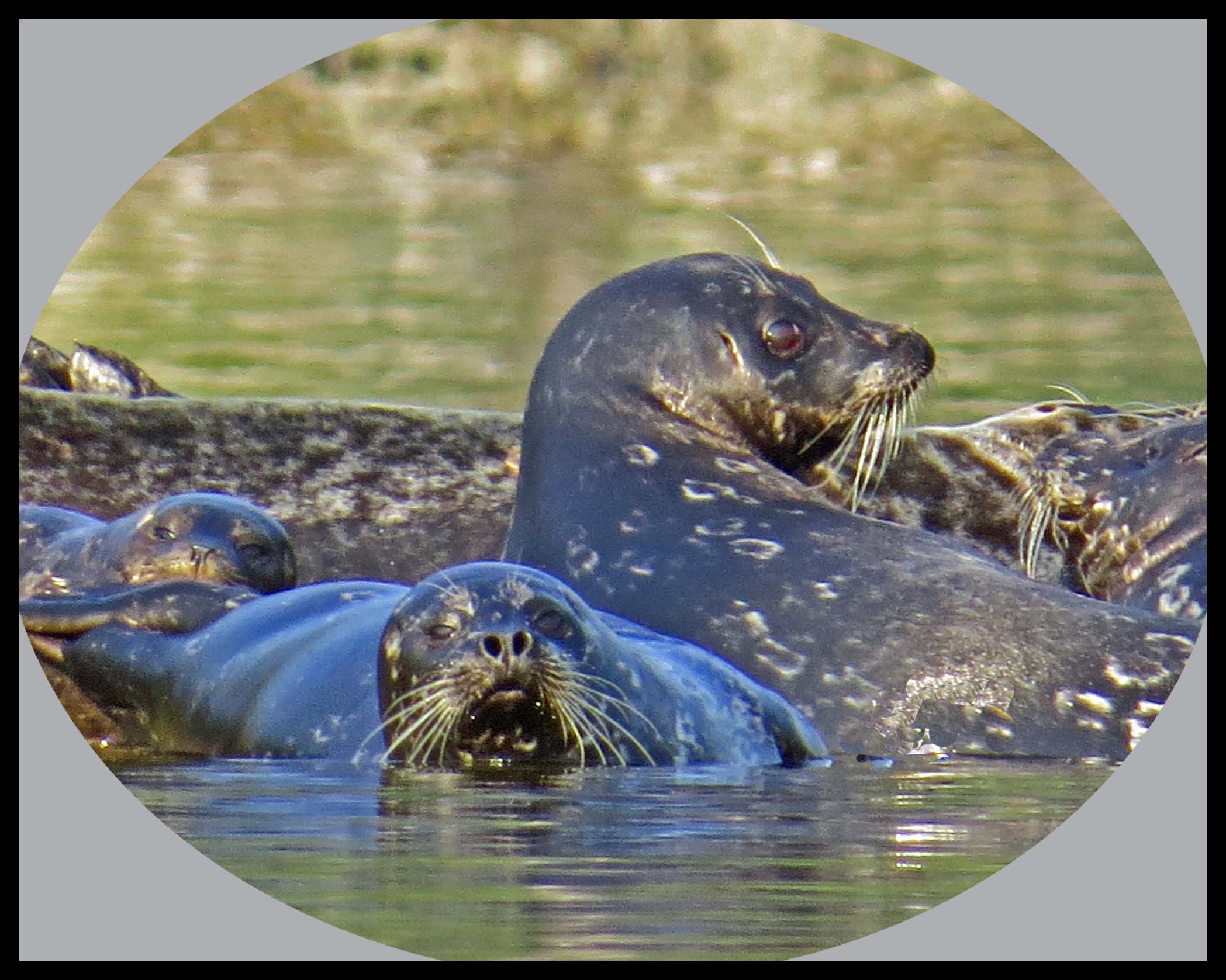 I headed back north, thinking I might try to get some decent pics of those elusive seals. I was in luck. The tide was at their favorite level for catching a siesta —not too high, and not too low. There were about 15 slumbering seals, dreaming of fat salmon, no doubt. This time, I assumed my stealth mode, positioning myself so that I didn’t have to paddle, but let the current carry me toward them, ever so slowly. I started shooting as soon I could shoot with 75X zoom. I clicked away, taking shot after shot, not knowing when they’d scramble for the safety of the water. It was hard to frame anything, because they were all in one big jumble. I just hoped I’d have something worth keeping when I did the editing.