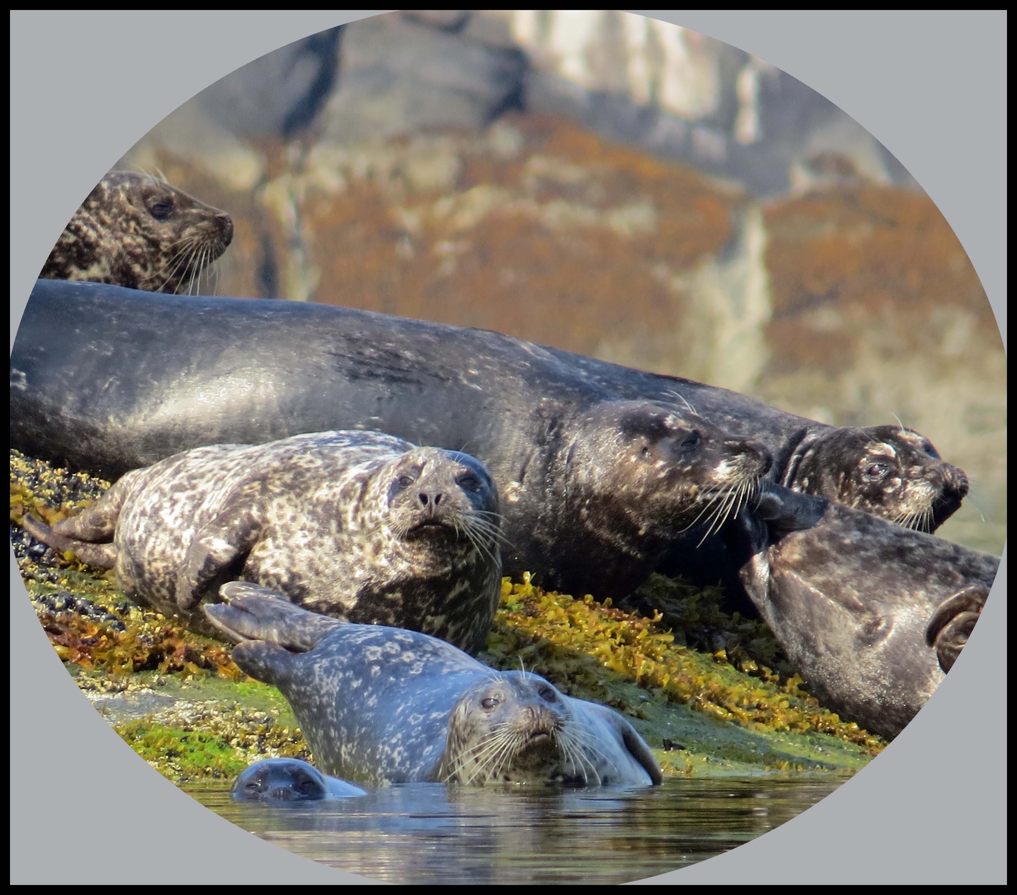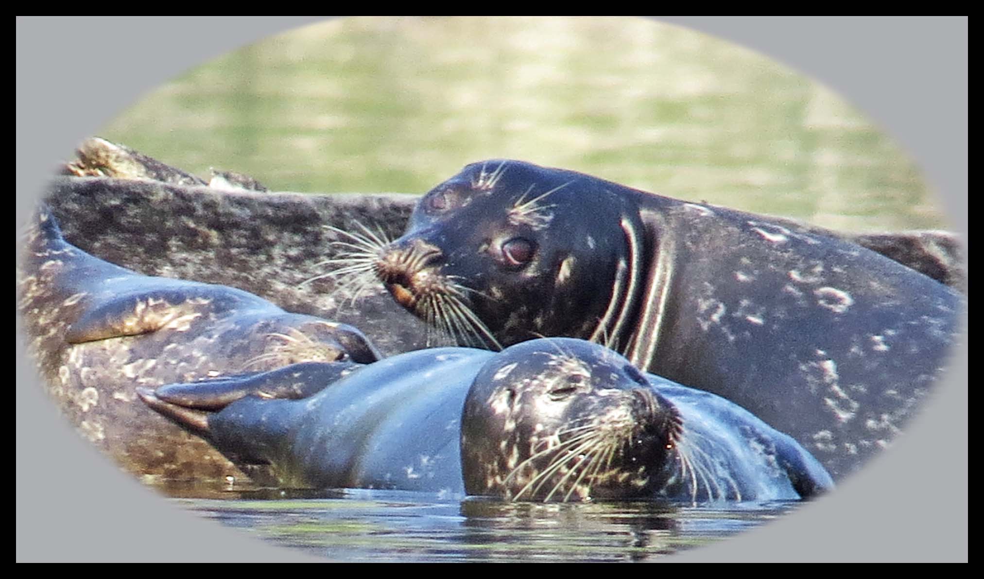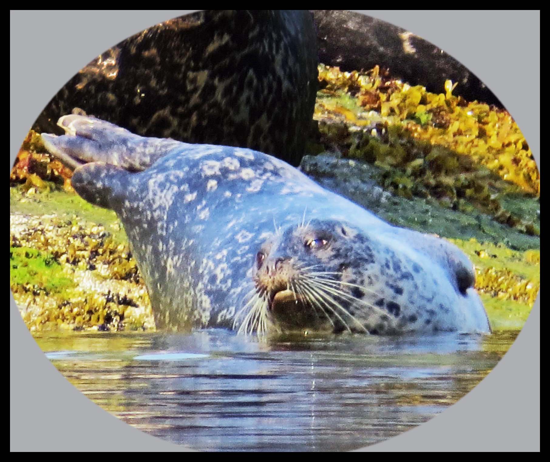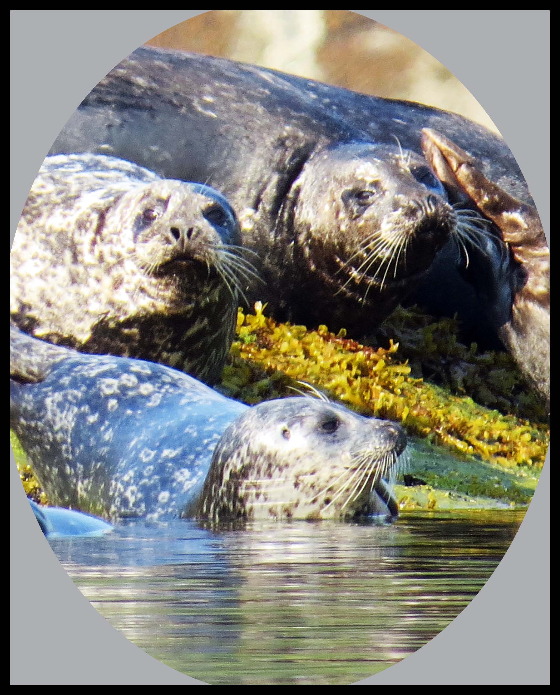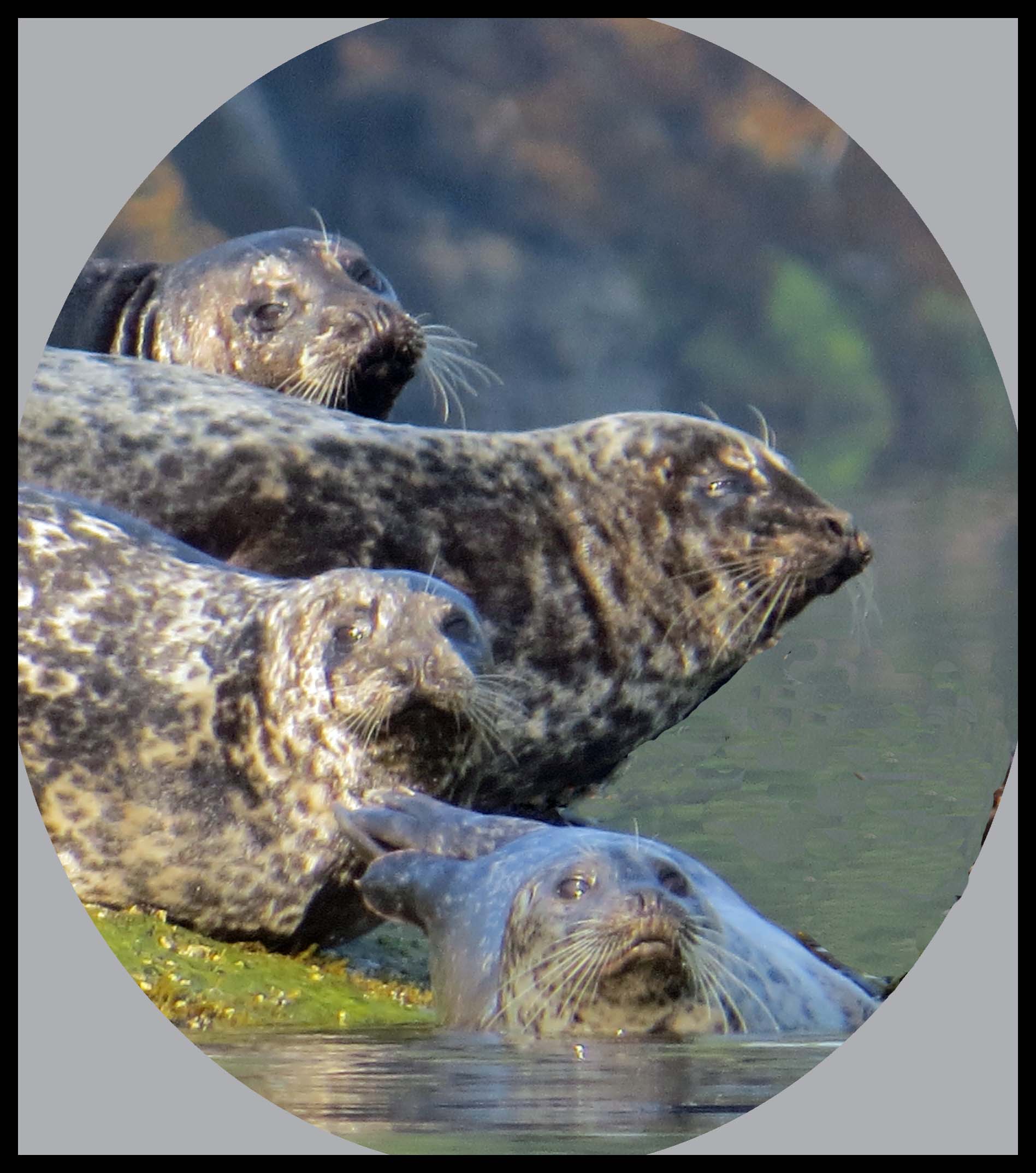 I headed back north, thinking I might try to get some decent pics of those elusive seals. I was in luck. The tide was at their favorite level for catching a siesta —not too high, and not too low. There were about 15 slumbering seals, dreaming of fat salmon, no doubt. This time, I assumed my stealth mode, positioning myself so that I didn’t have to paddle, but let the current carry me toward them, ever so slowly. I started shooting as soon I could shoot with 75X zoom. I clicked away, taking shot after shot, not knowing when they’d scramble for the safety of the water. It was hard to frame anything, because they were all in one big jumble. I just hoped I’d have something worth keeping when I did the editing.