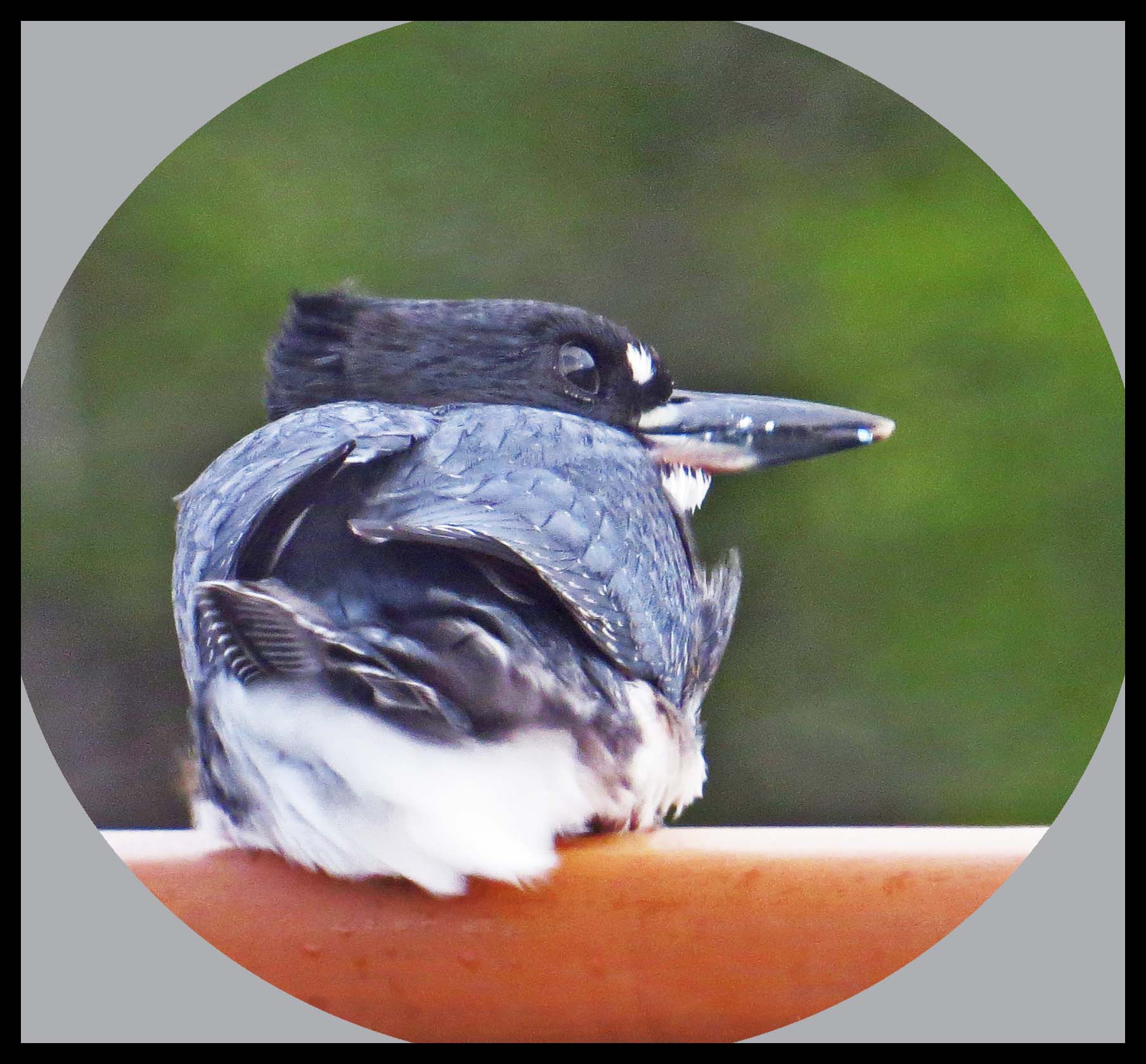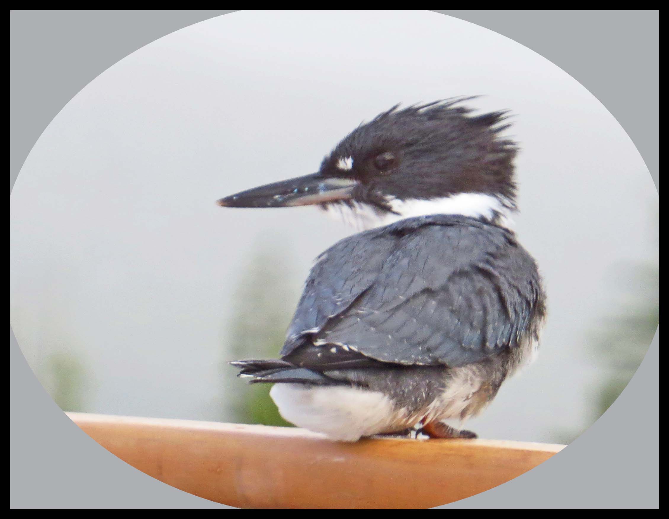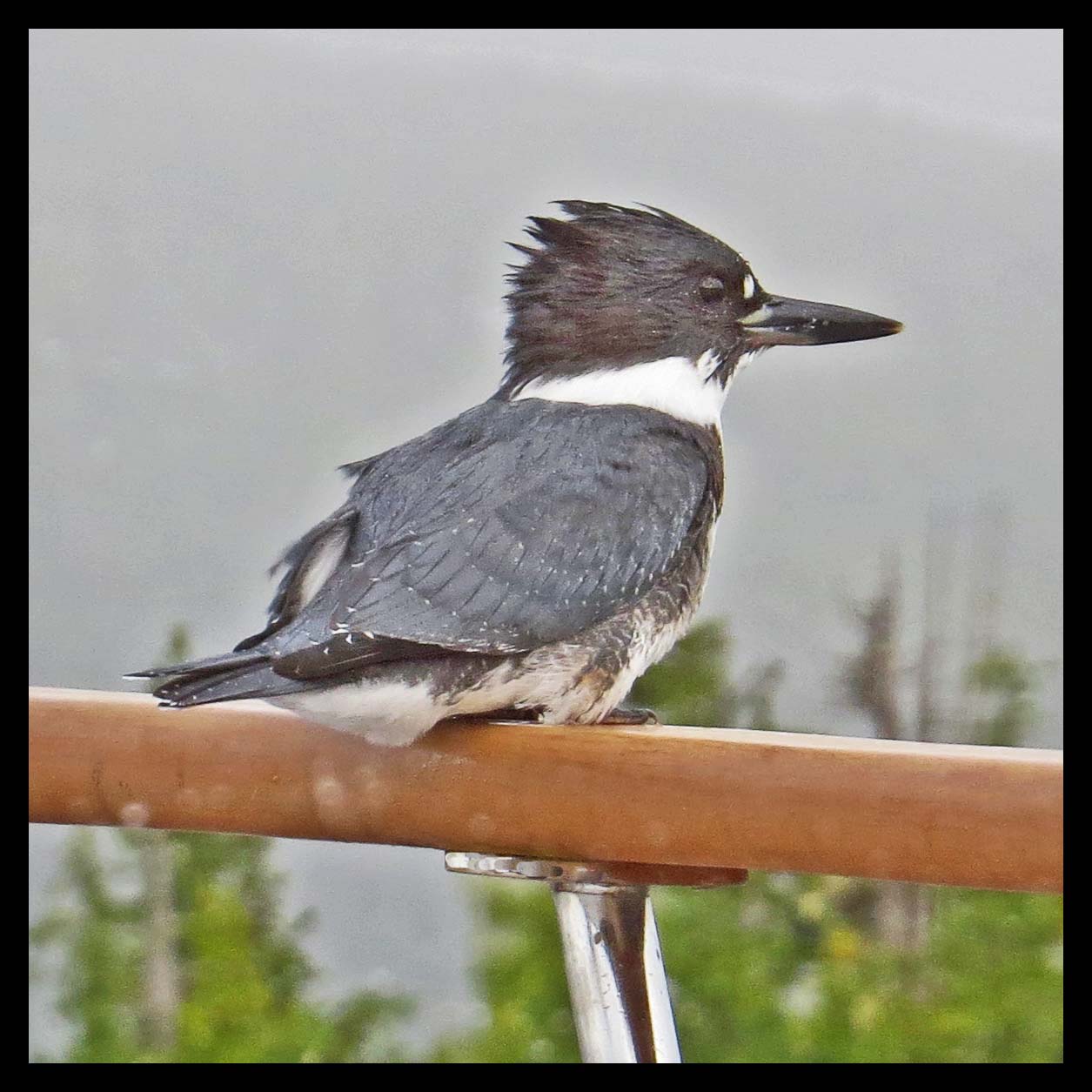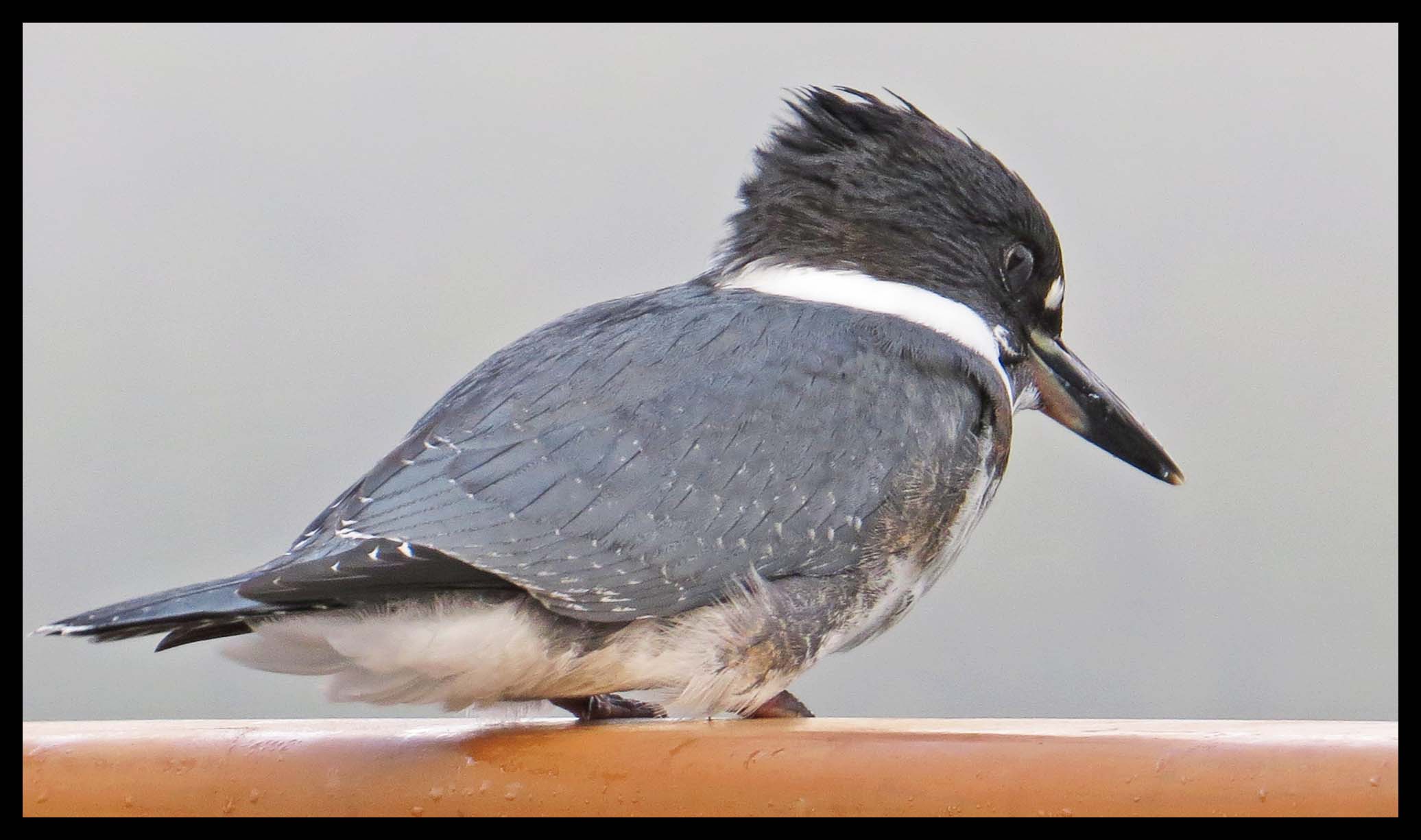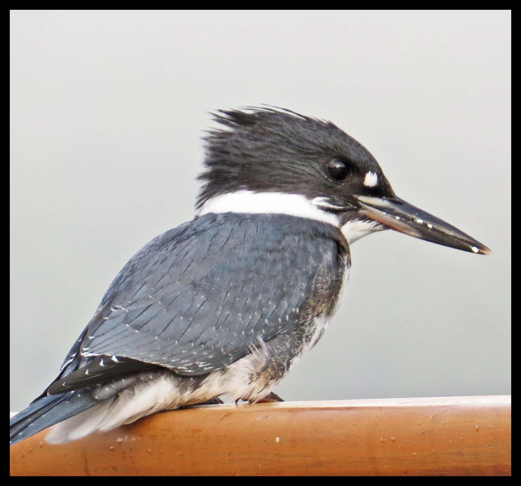 A pair of Kingfishers visited the boat off and on all day. They’d sit on our rail, looking for fish. Kingfishers must have incredible eyes, because the fish they’re after are teeny weeny. They apparently don’t like the heads, so they left the teeny weeny heads on the deck for us to dispose of.