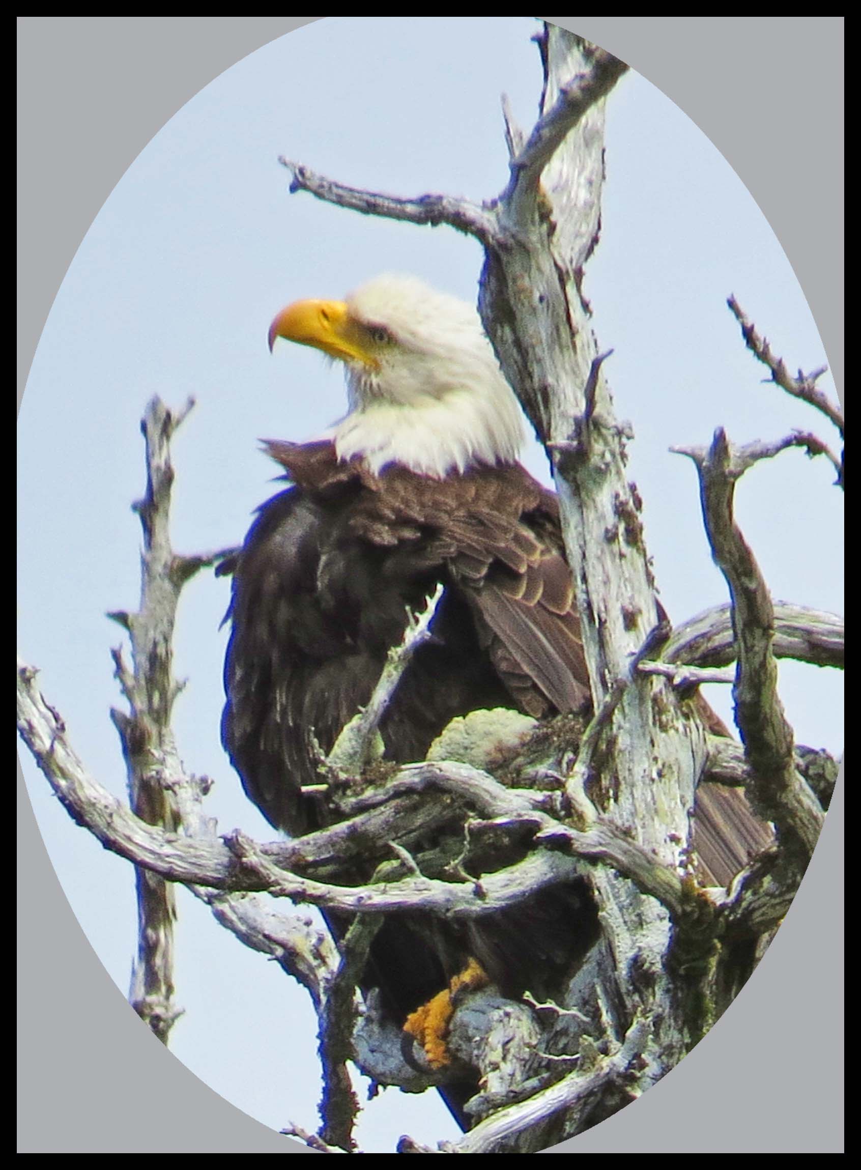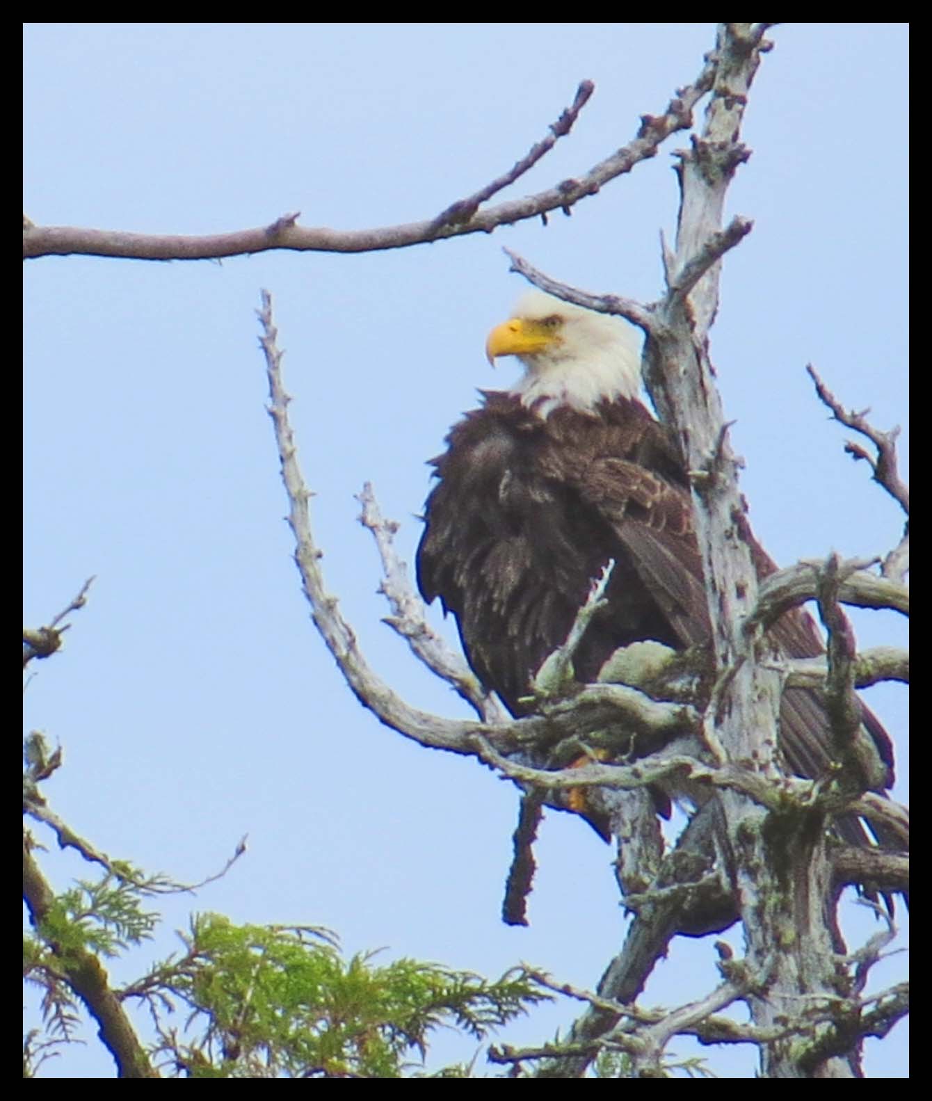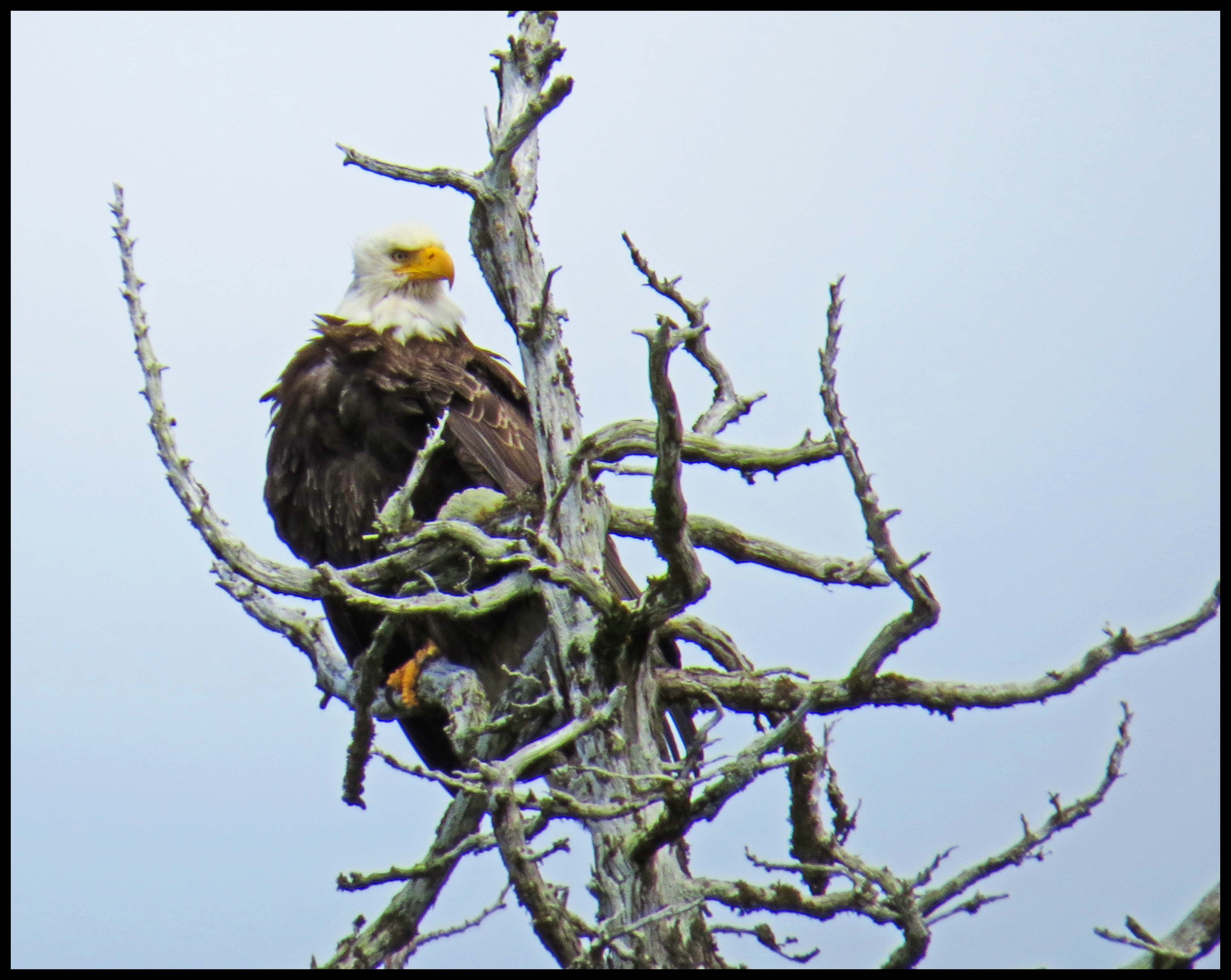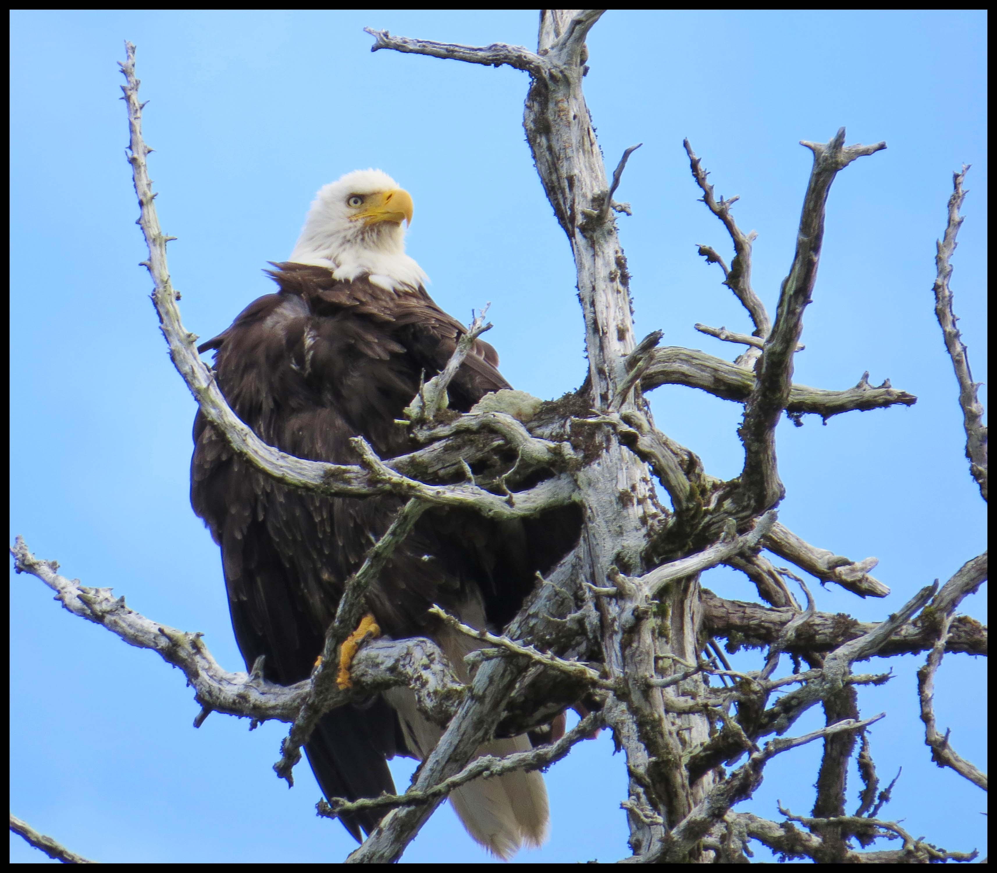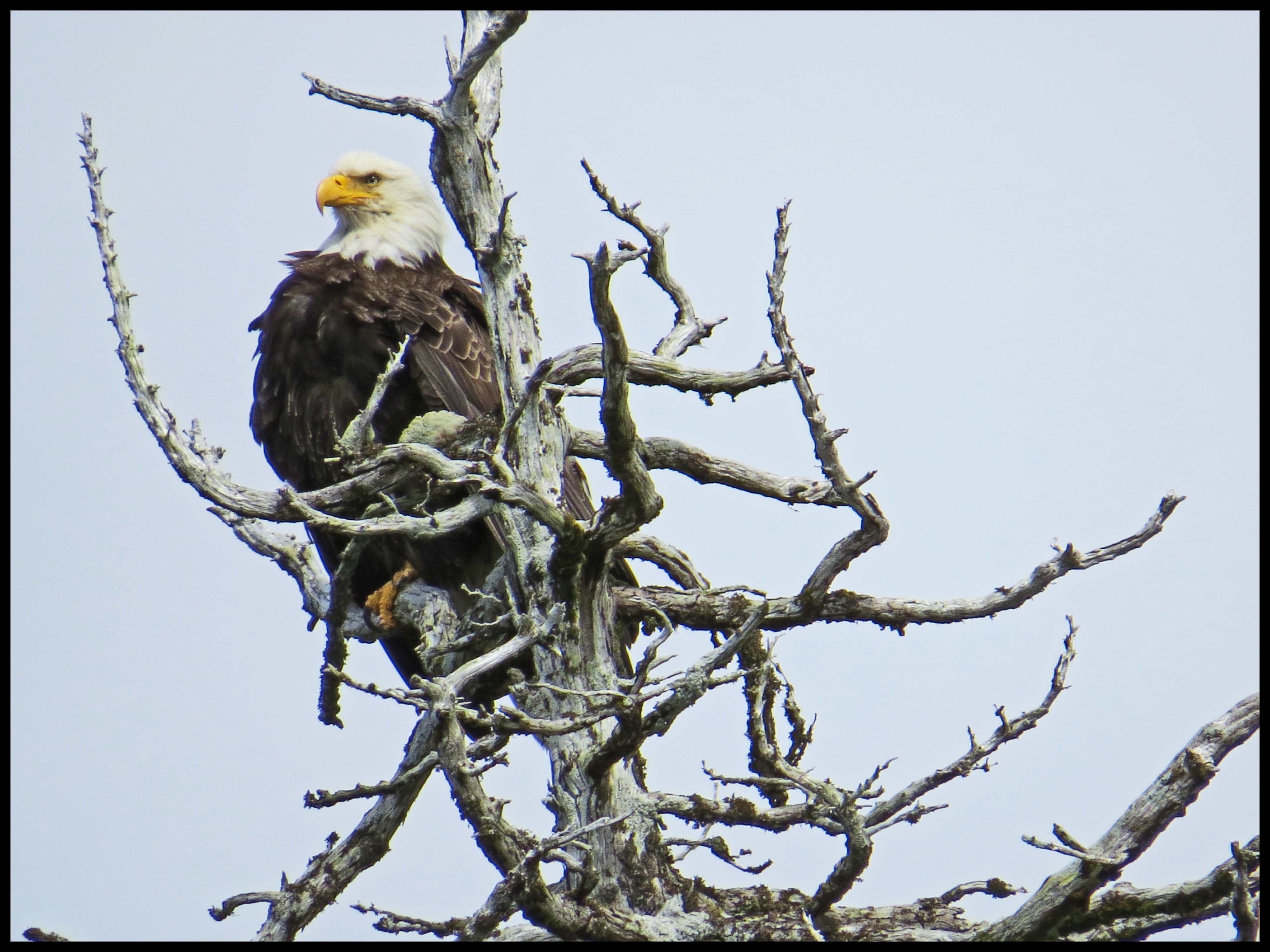 I thought that there would be lots of wildlife here. But, I paddled and paddled and never found anything until I was almost back to the boat, when I spotted this eagle in one of those tortured trees.
