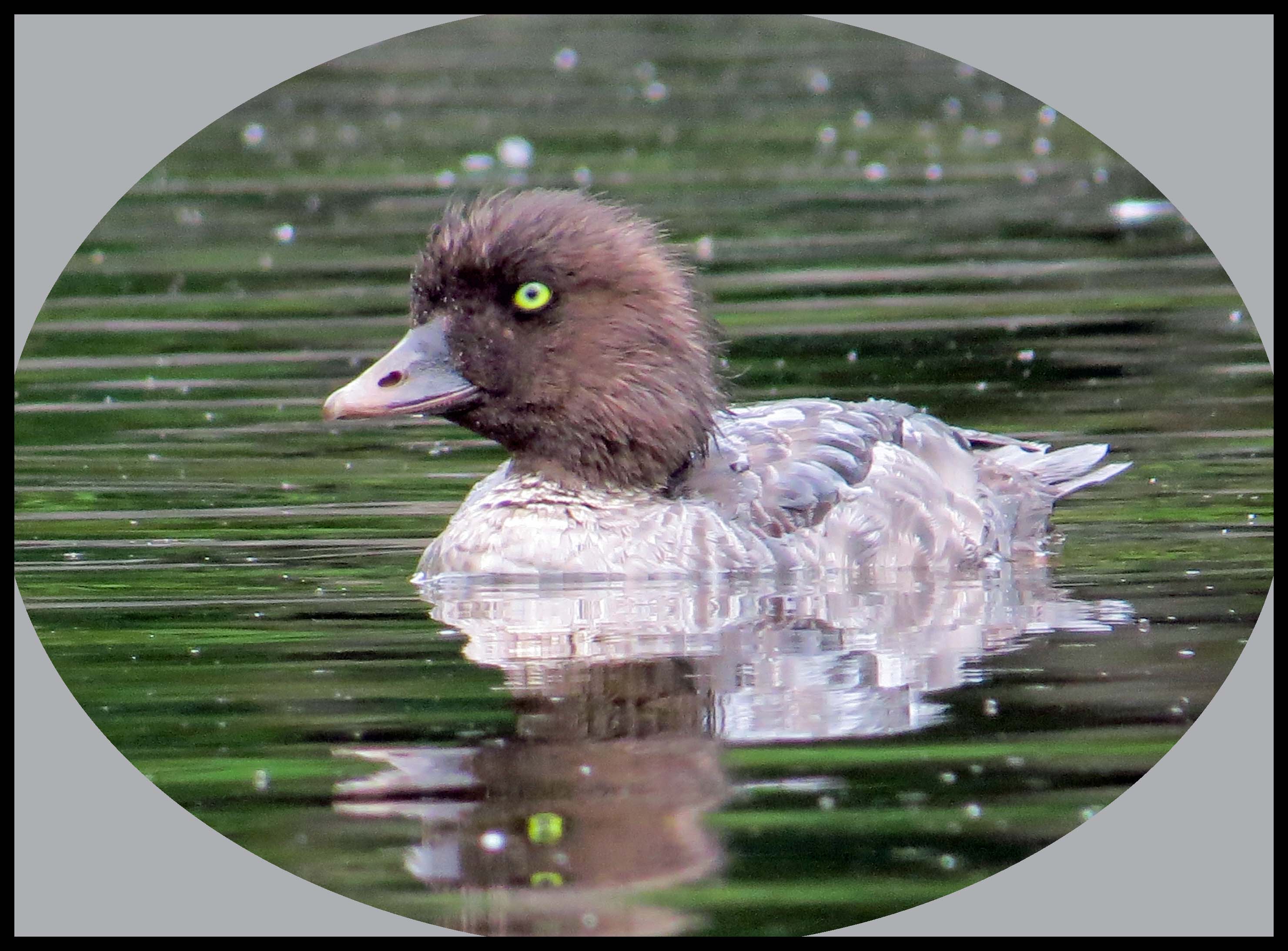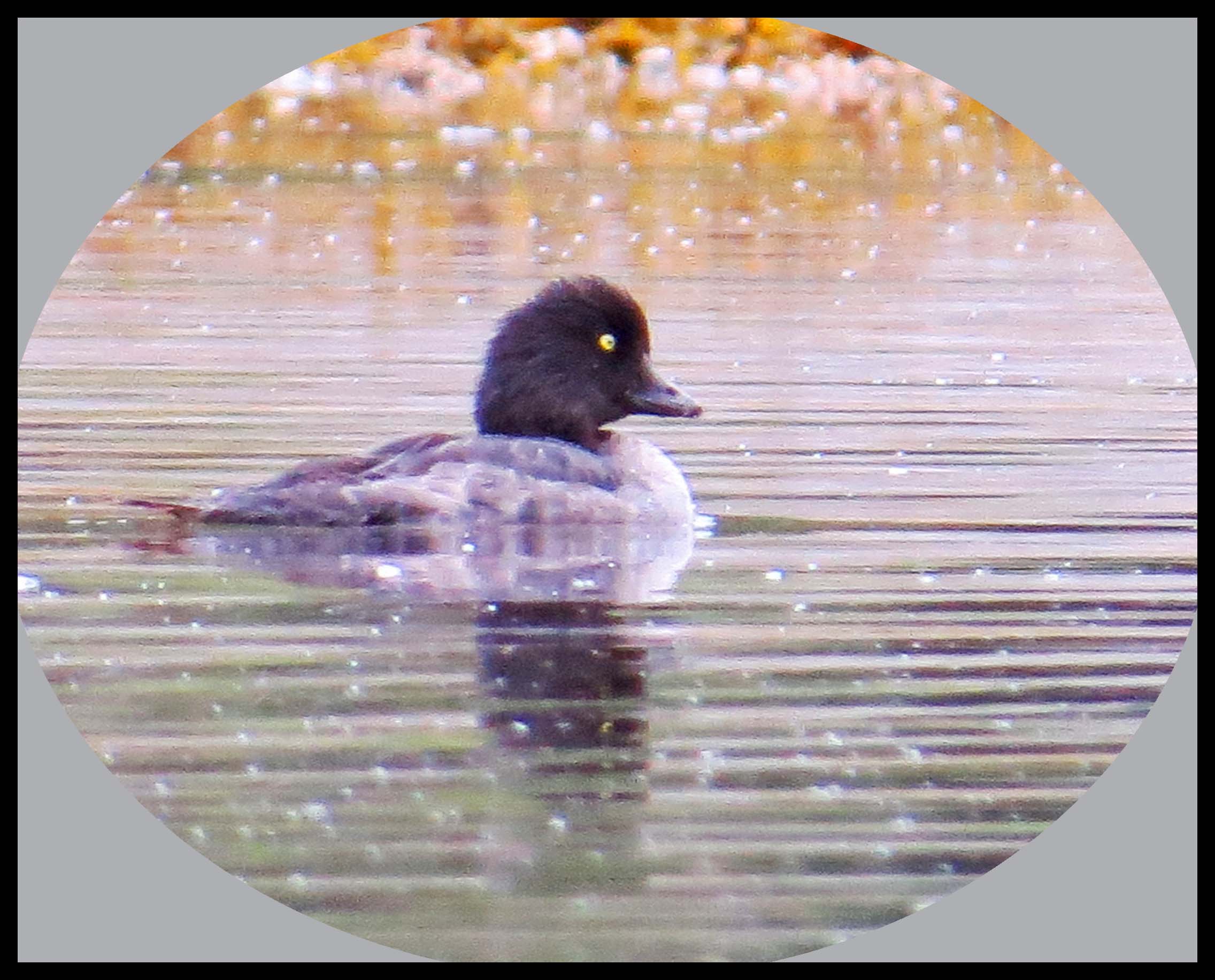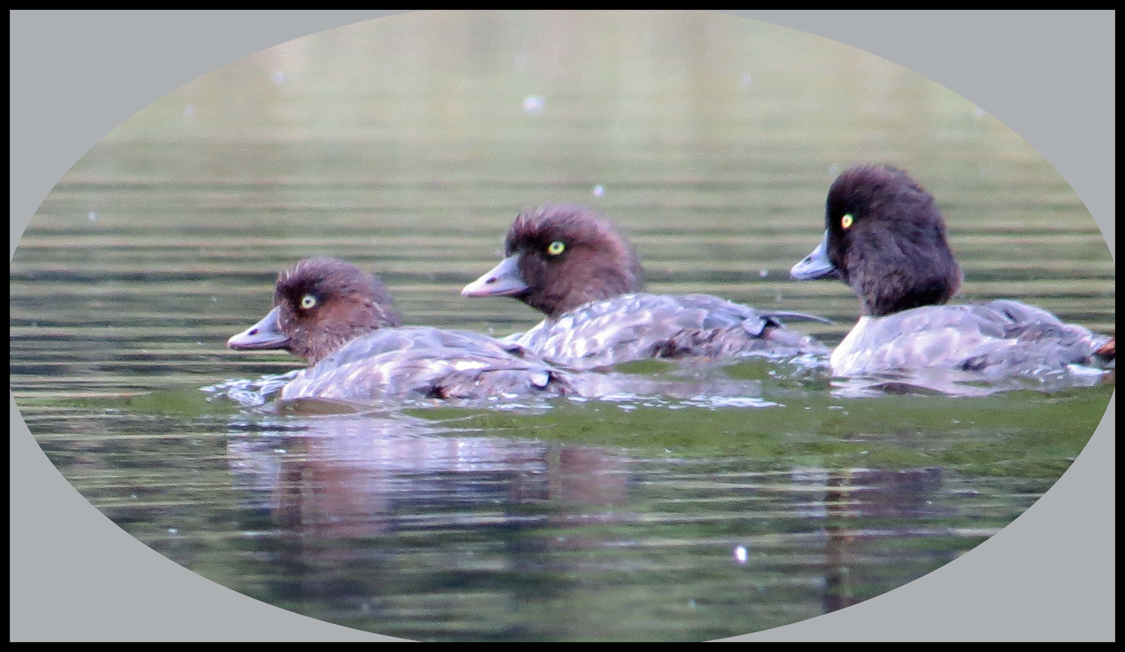 It isn’t foggy this morning, but it looks like there’s a strong possibility it might rain. I was paddling toward the head of the harbour when I spotted a female Goldeneye with three of her young ones.