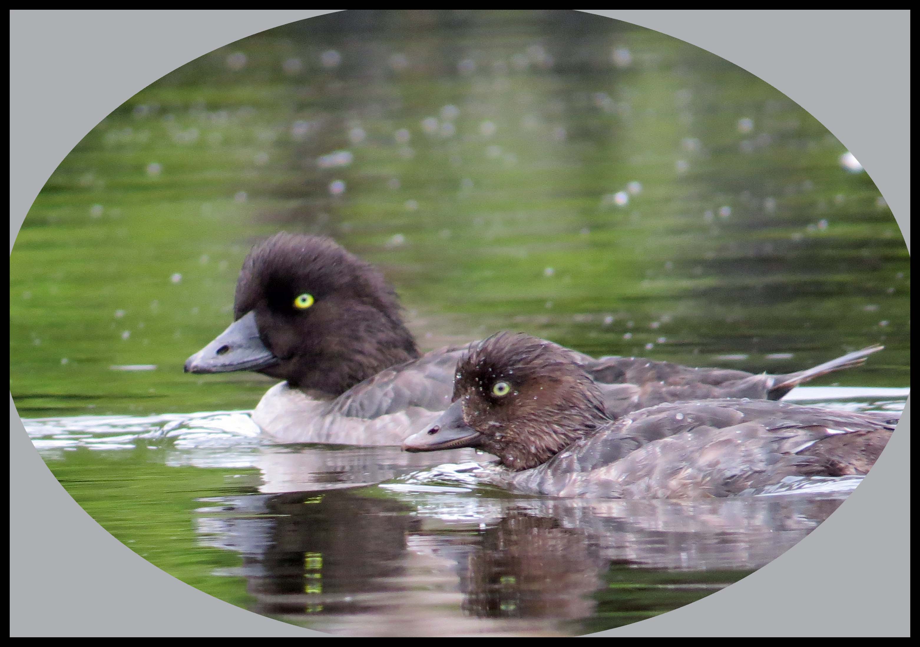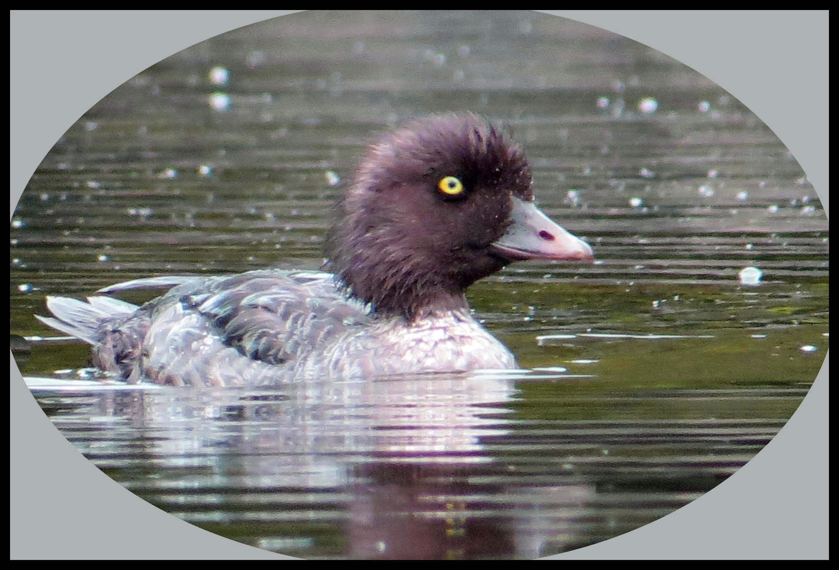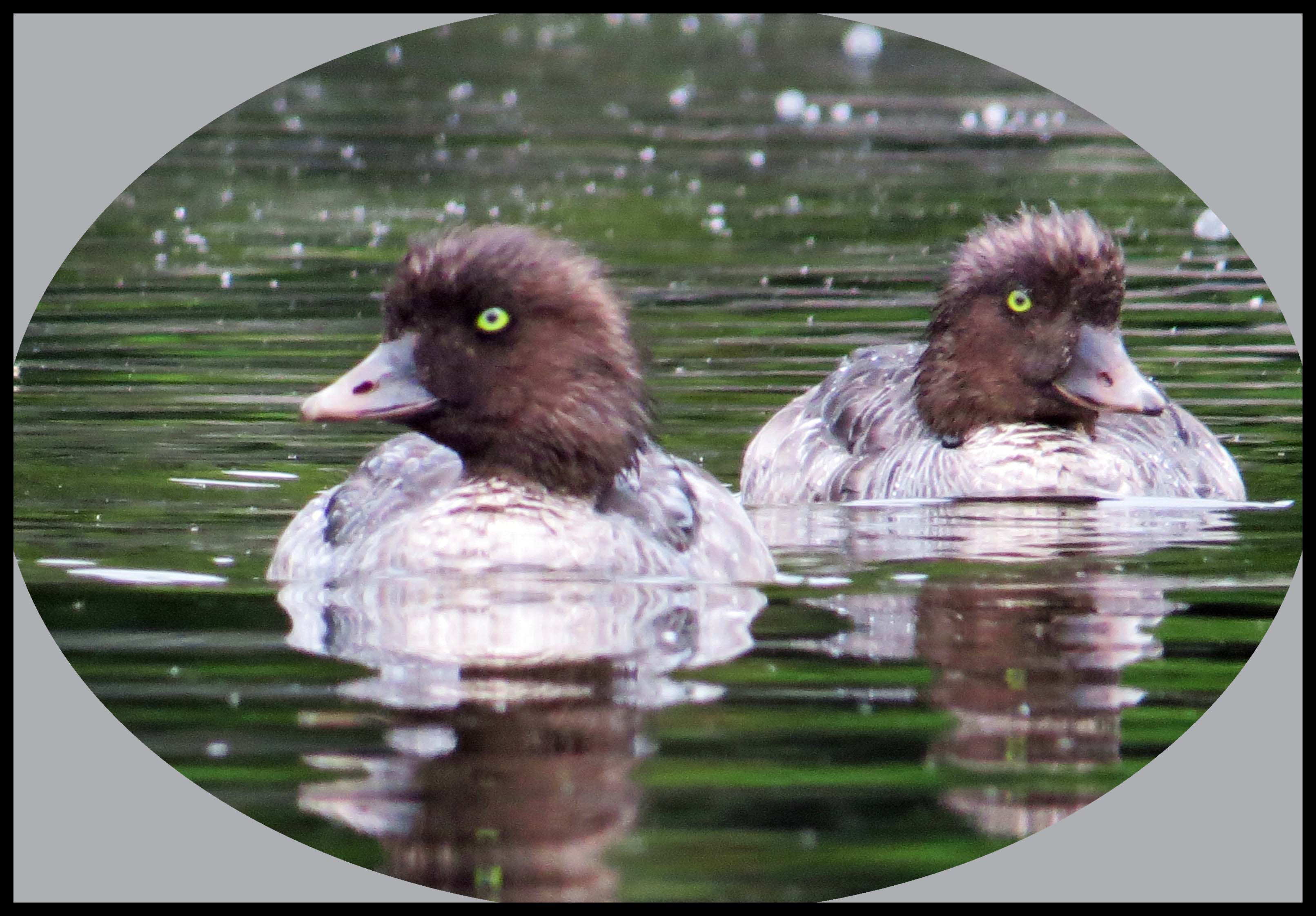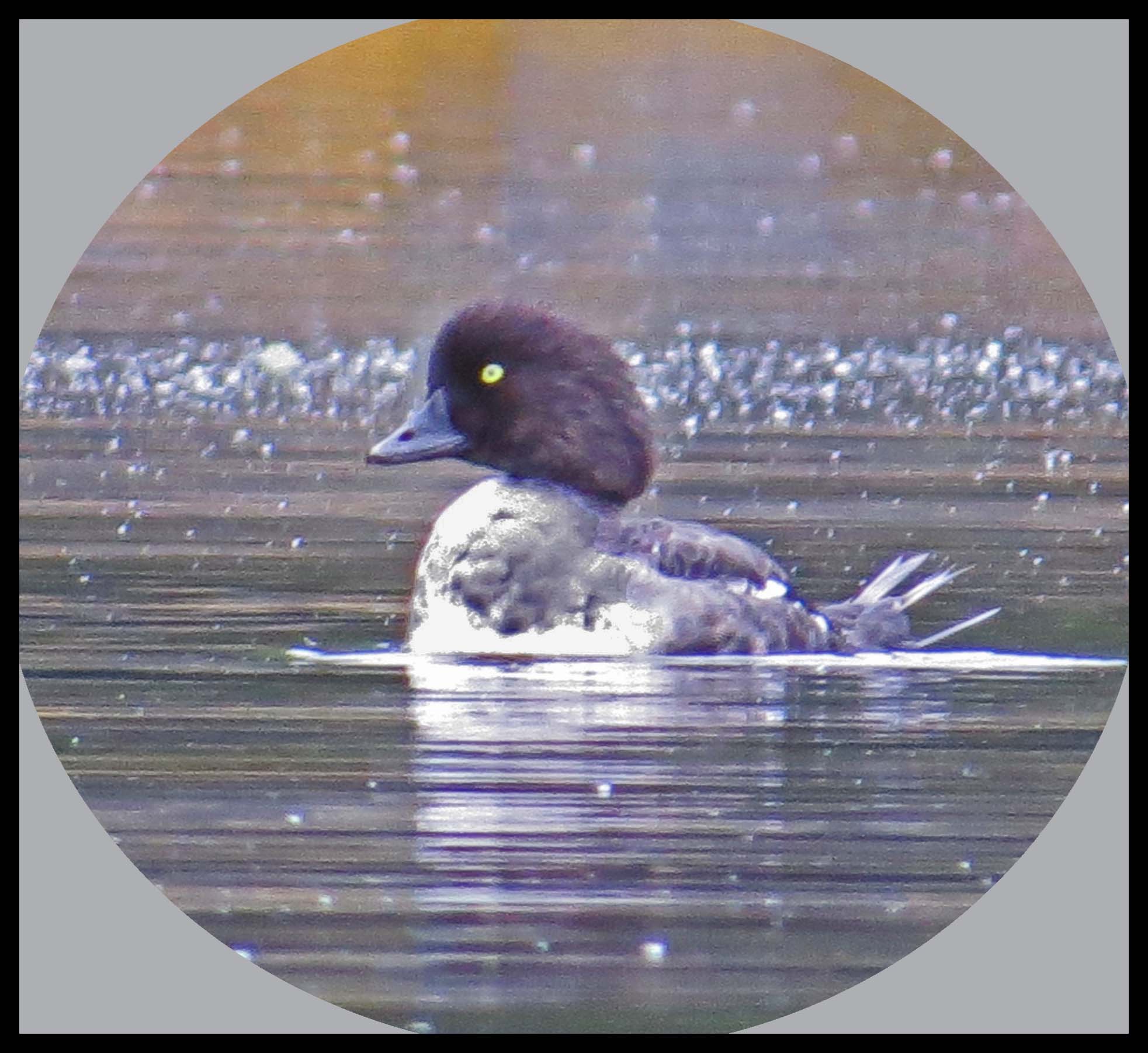 It isn’t foggy this morning, but it looks like there’s a strong possibility it might rain. I was paddling toward the head of the harbour when I spotted a female Goldeneye with three of her young ones.