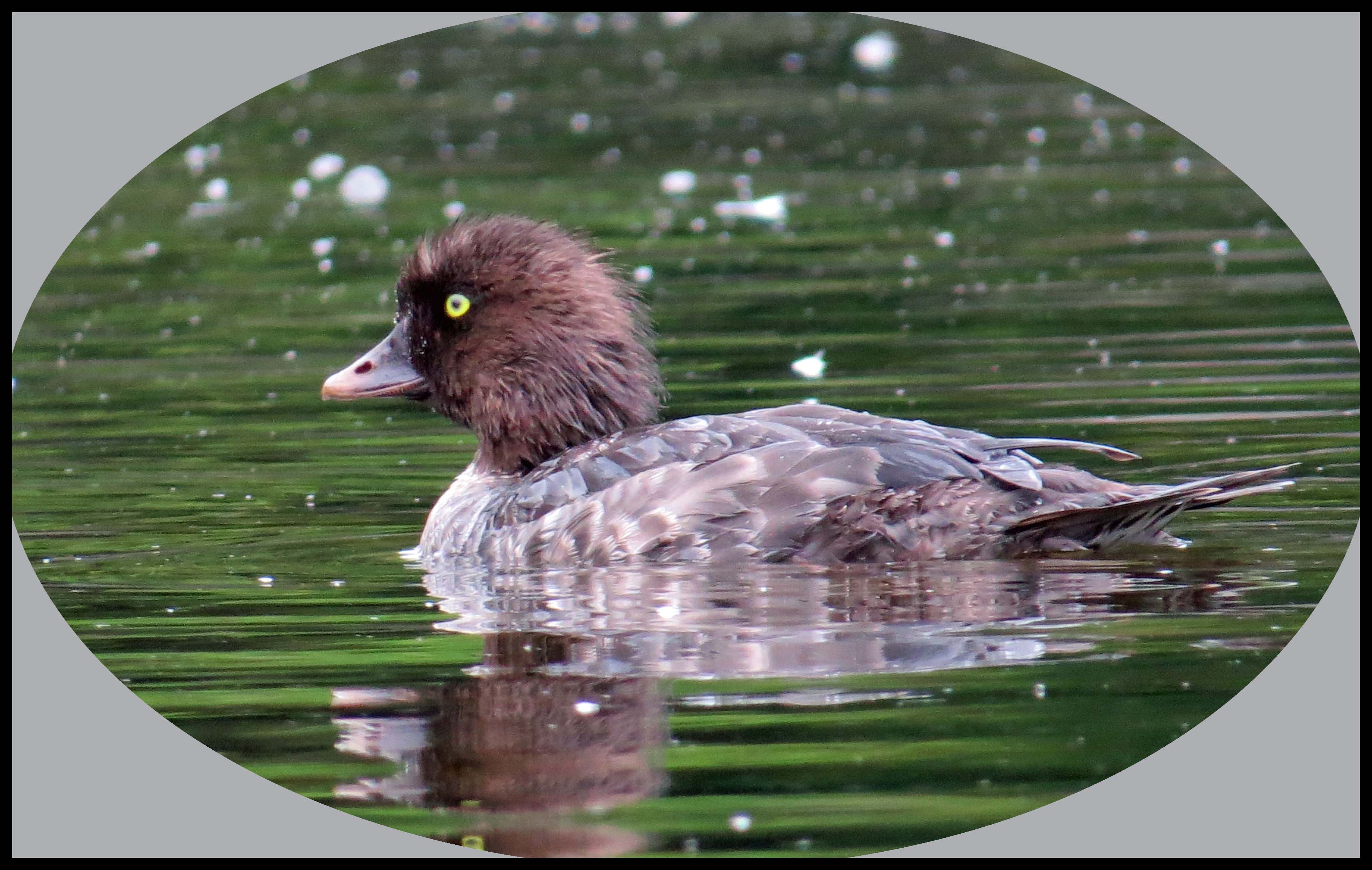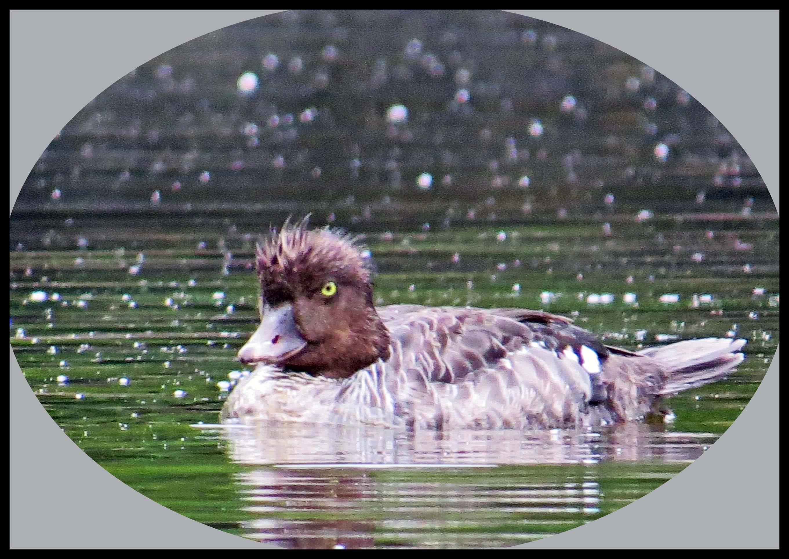 While I was pursuing the Goldeneyes, another duck that I’ve never seen before landed on the water nearby. It appeared to have a tiny green spot on the wing. When I checked my Audubon Field Guide, it confirmed that it was a female Green-winged Teal.