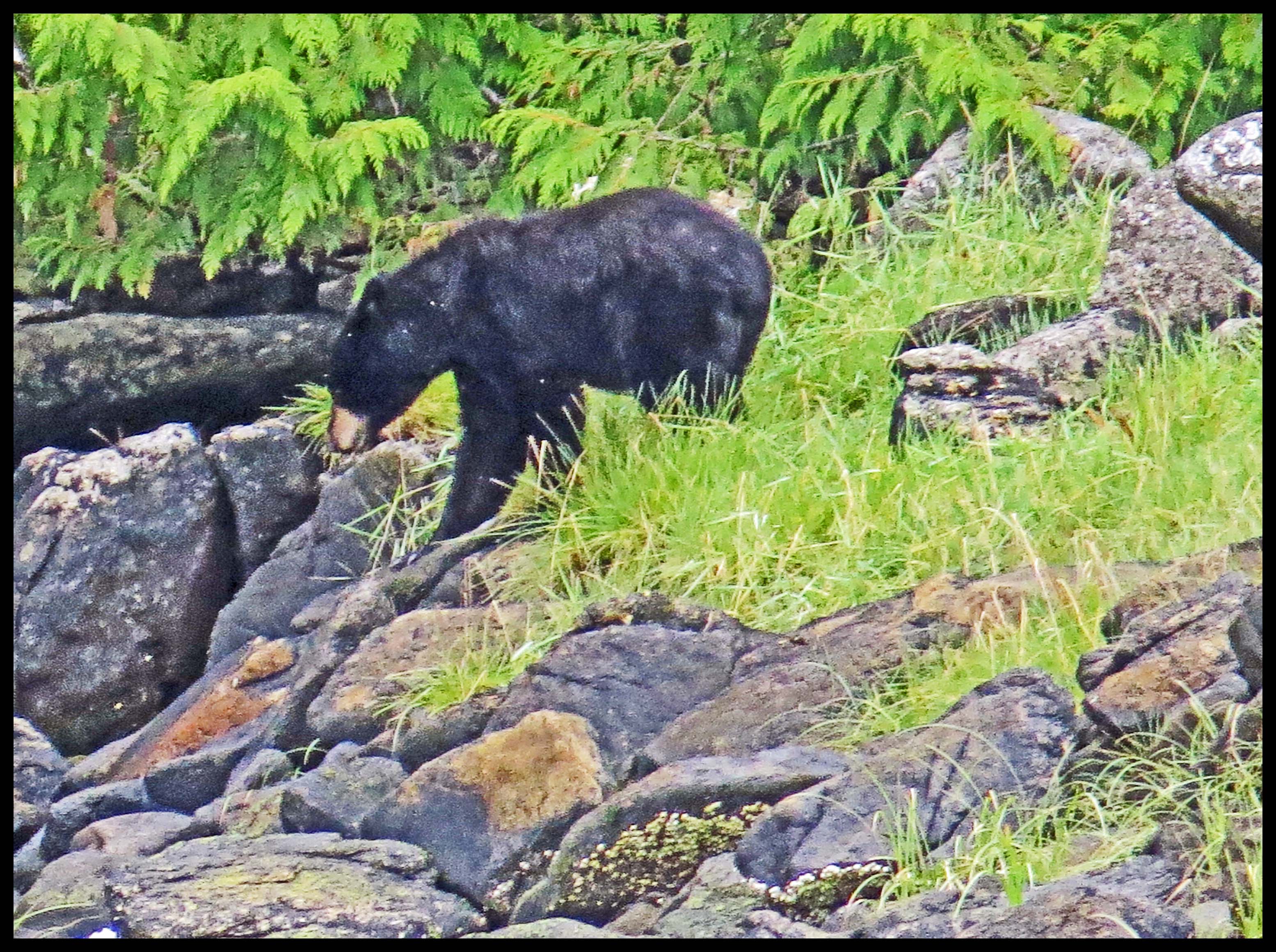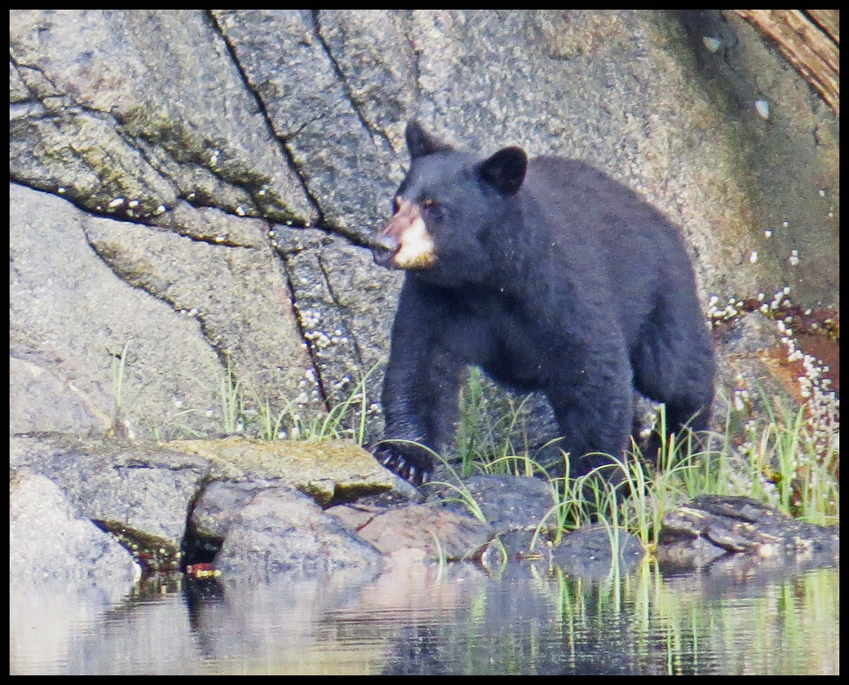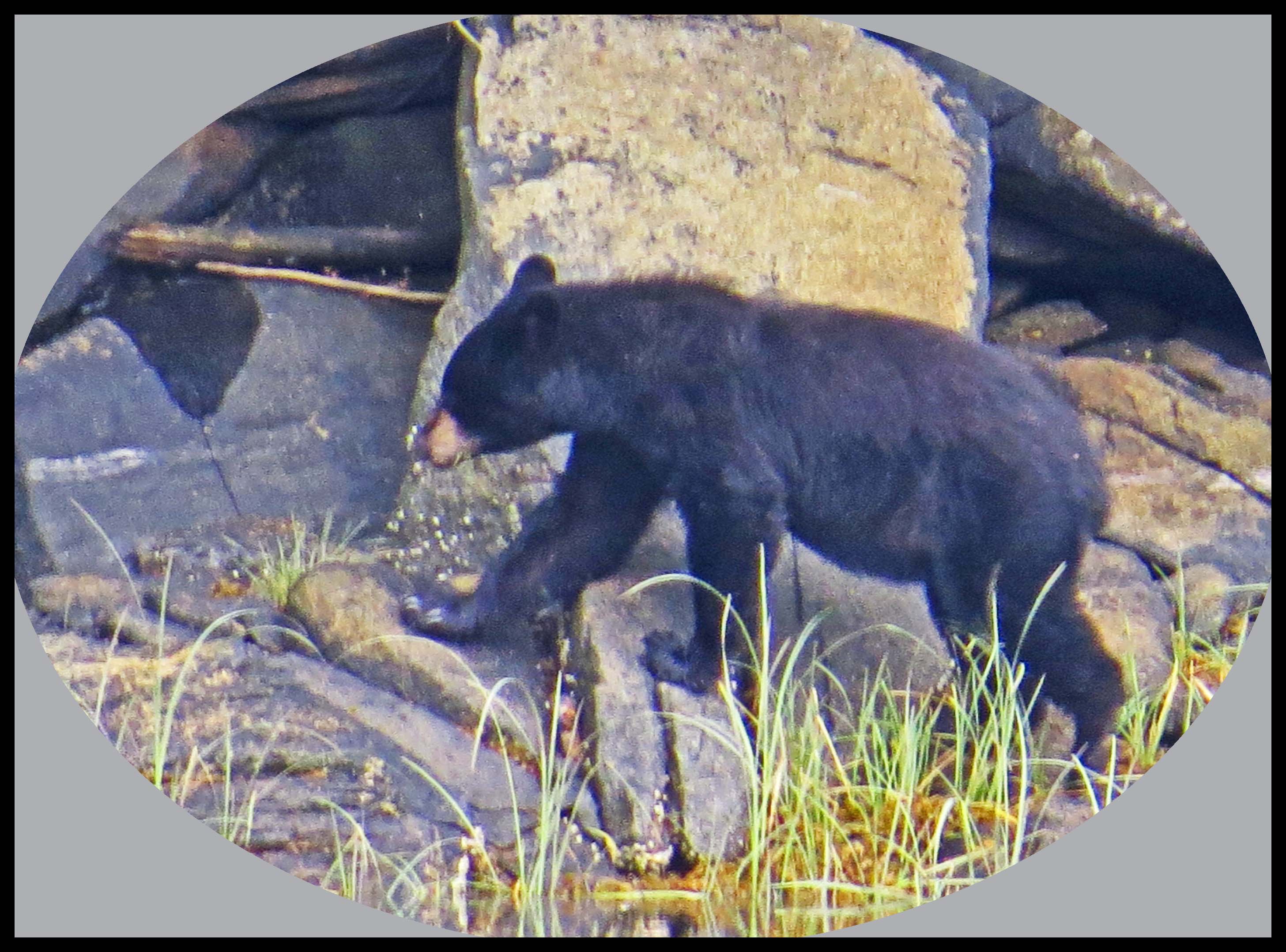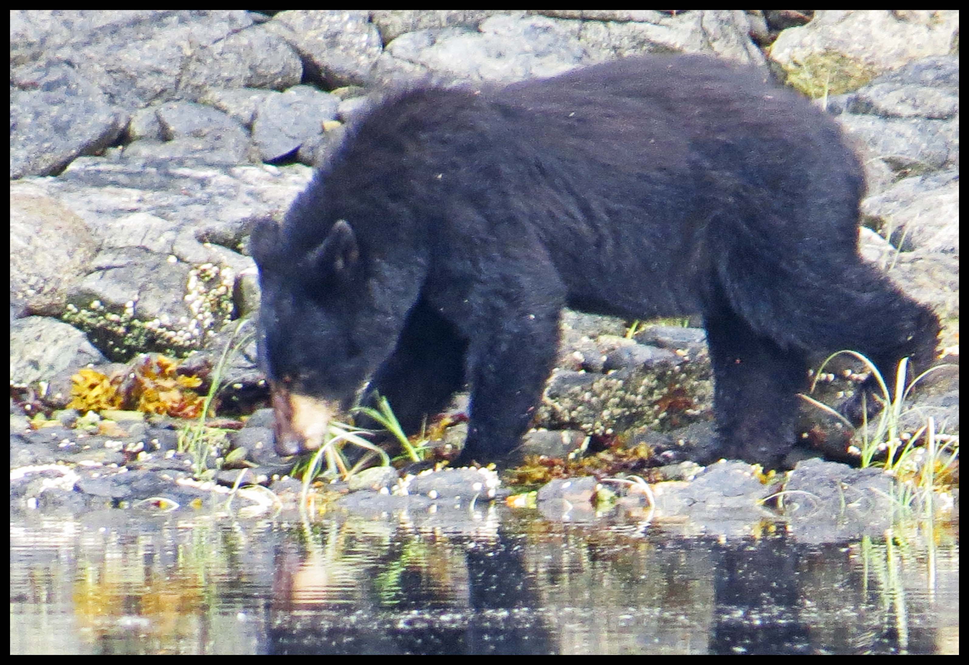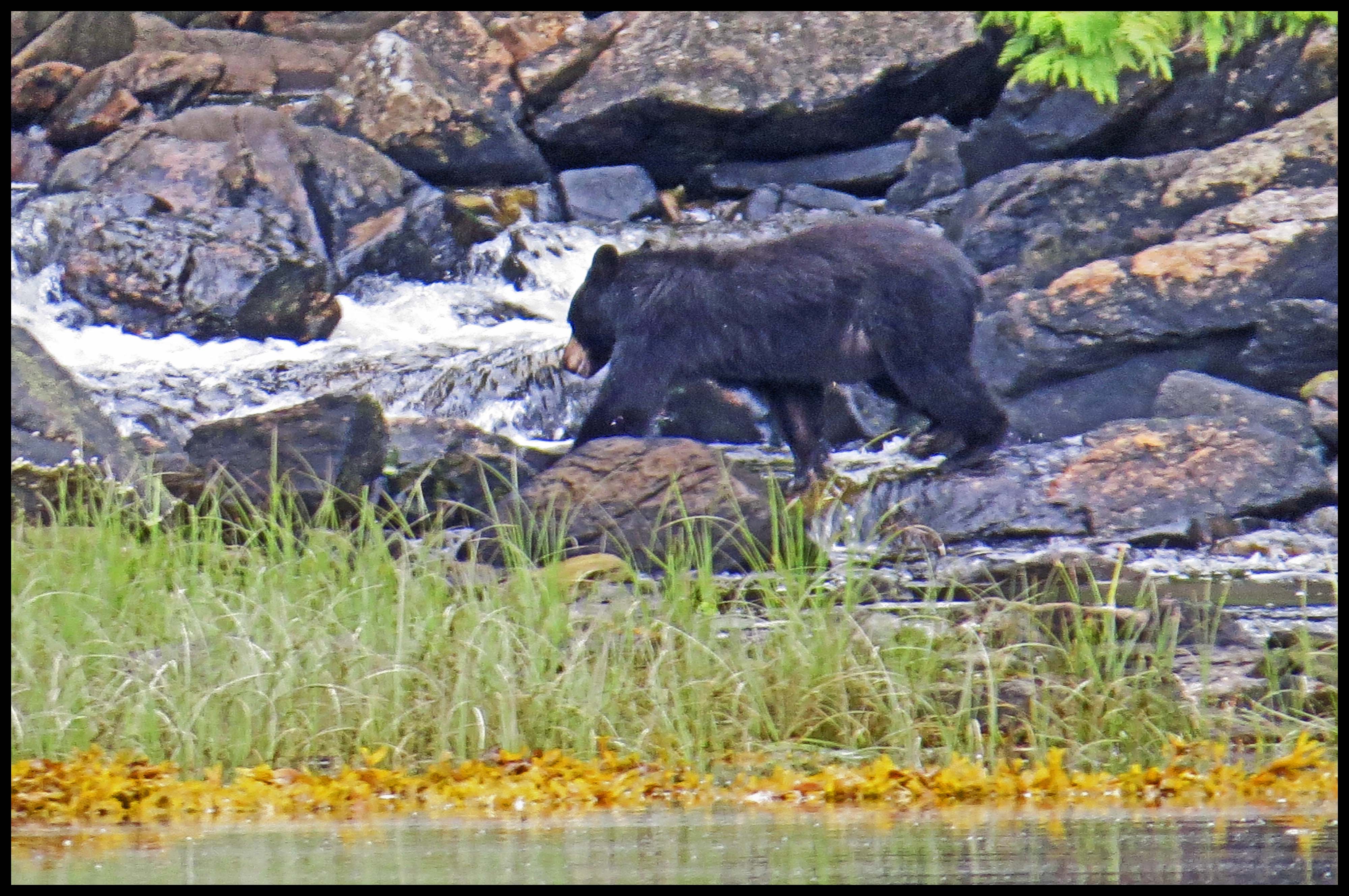 The Teal didn’t hang around long enough for more than this one photo. As I was deciding which way I wanted to paddle, I noticed something dark on shore. I figured it was just a dark rock, until it moved. Turned out it was a young bear foraging for whatever he could find to eat.
