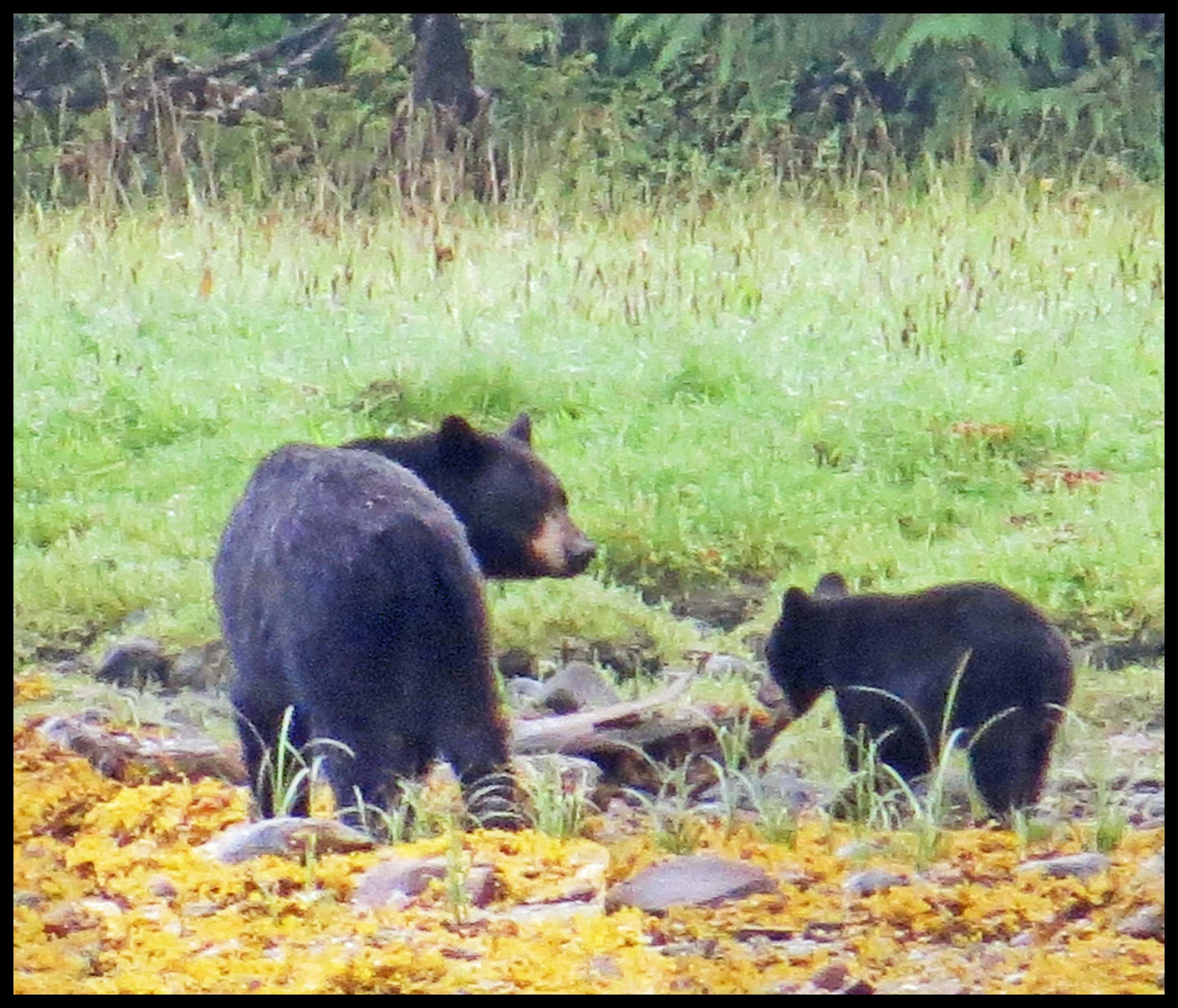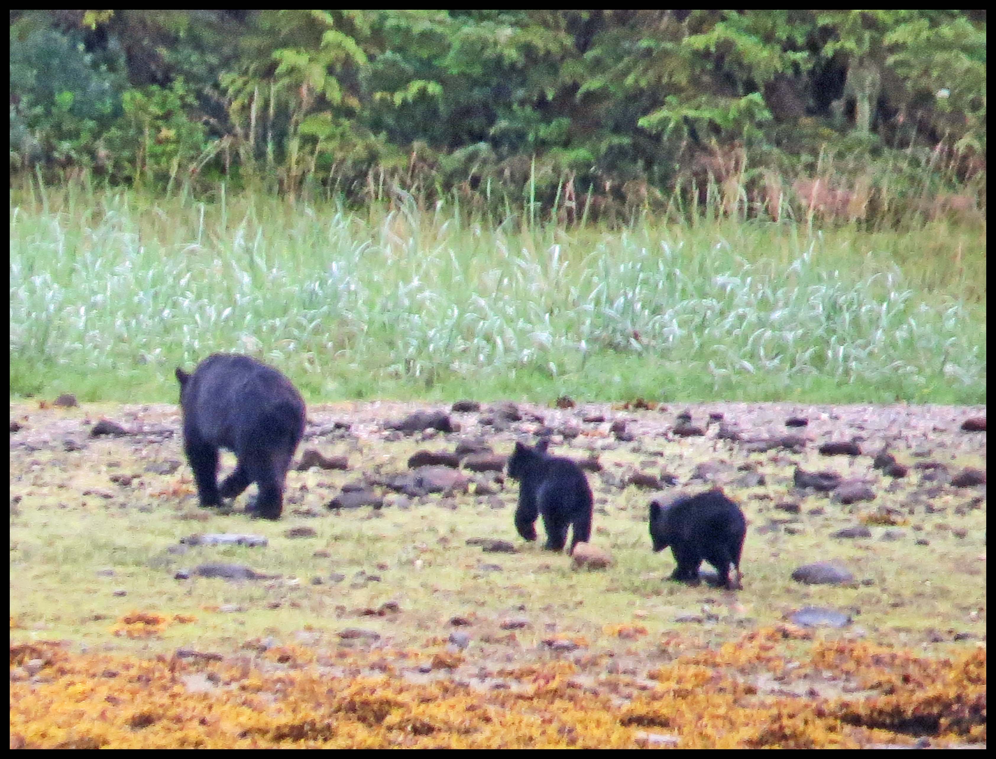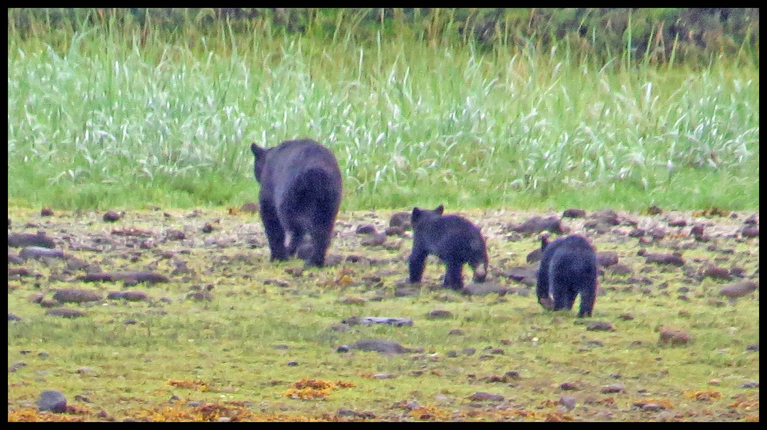 Then, along came papa and mama bear and their two cubs. Papa bear ran ahead to the creek, where I couldn’t get a shot. But, mama and the two cubs kept heading my way. She didn’t see anything that interested her on the shore. Maybe the cubs hadn’t yet learned how to get at the goodies hiding under the rocks. They headed for the tall grass instead.