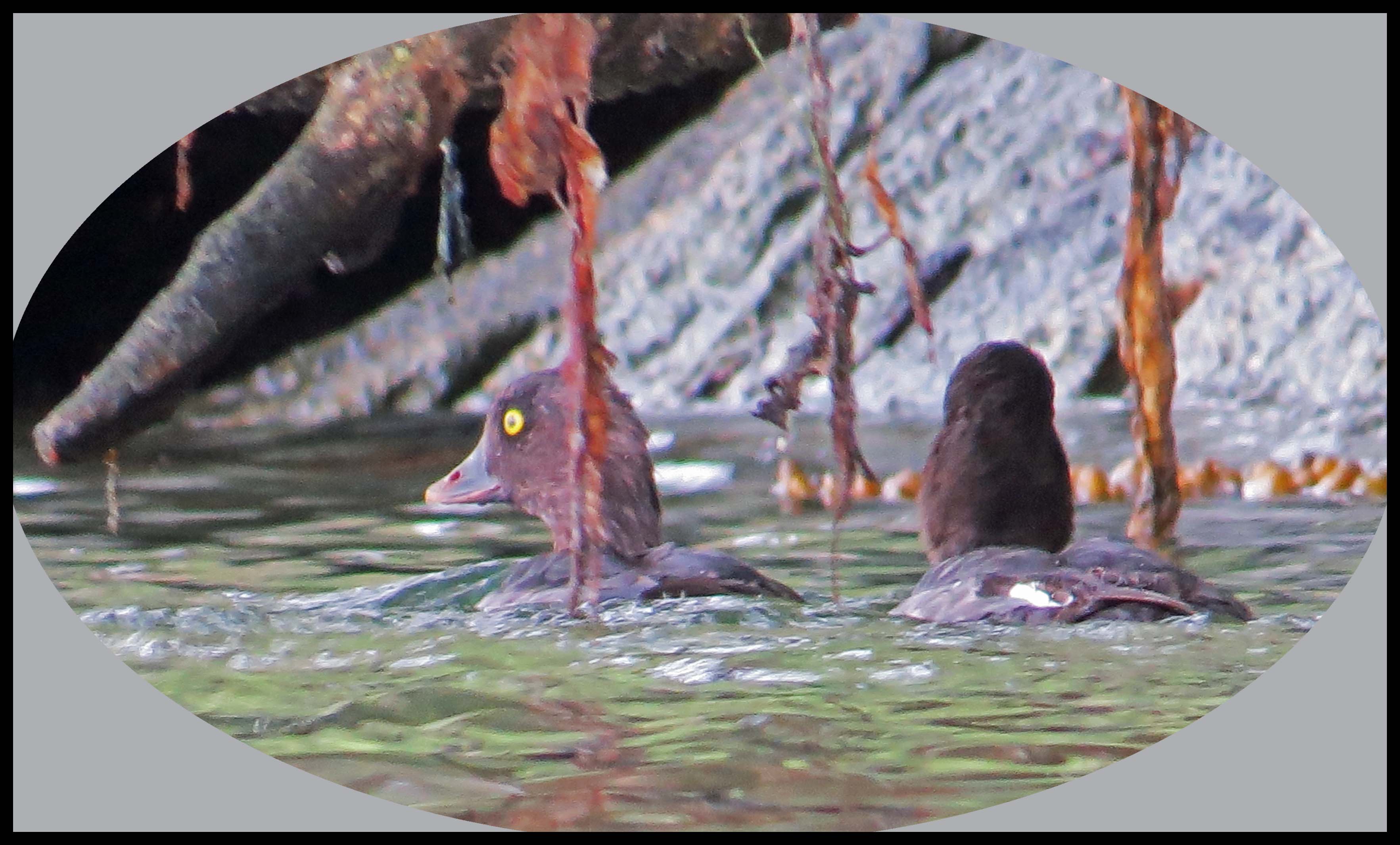 Then, I saw this pair of camera-shy Goldeneyes sneaking along the shore.