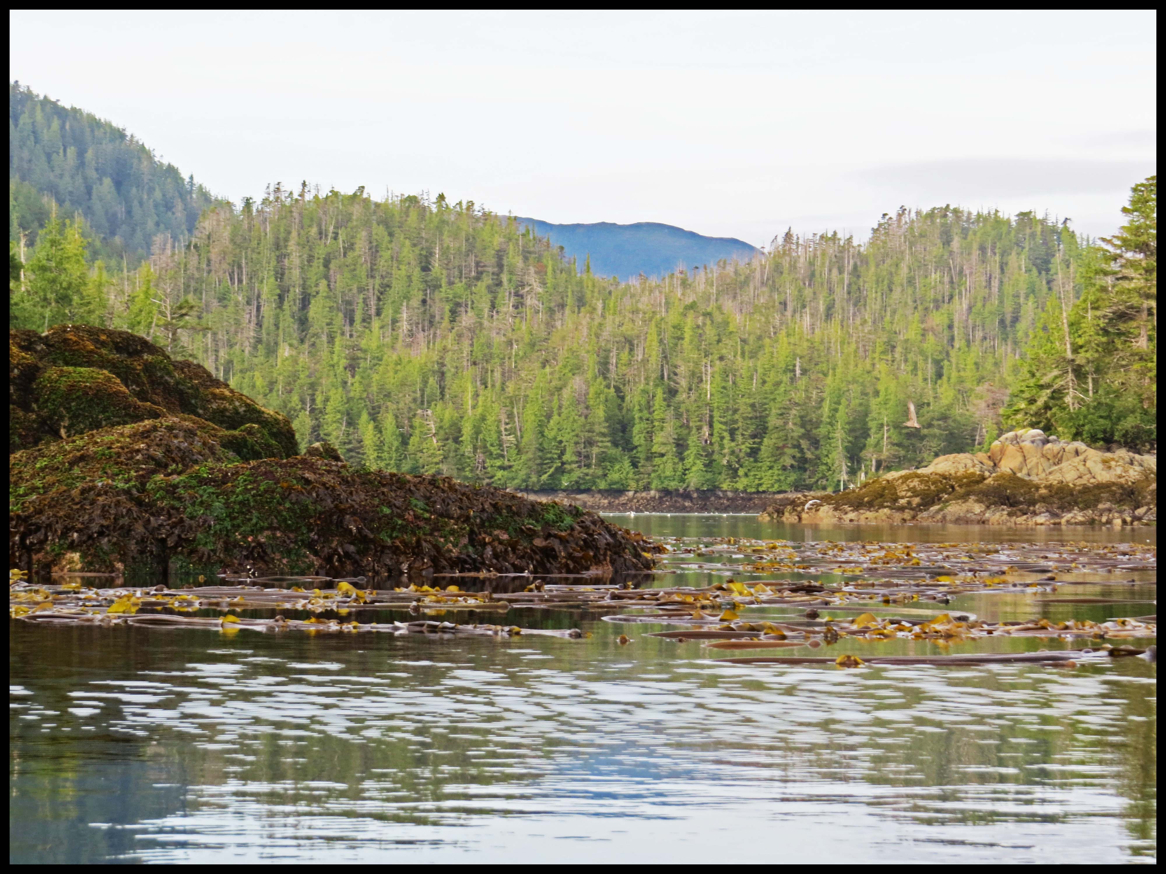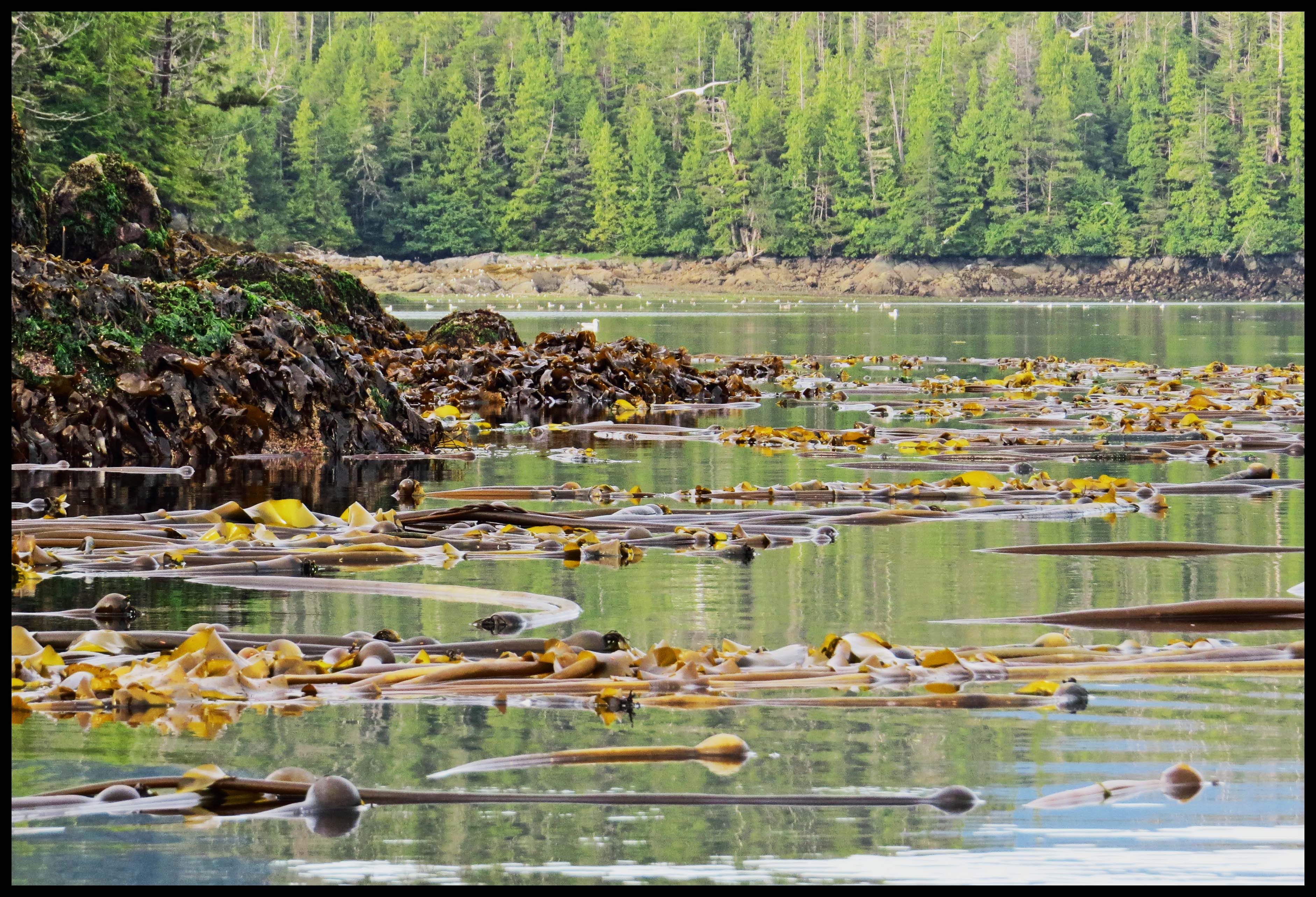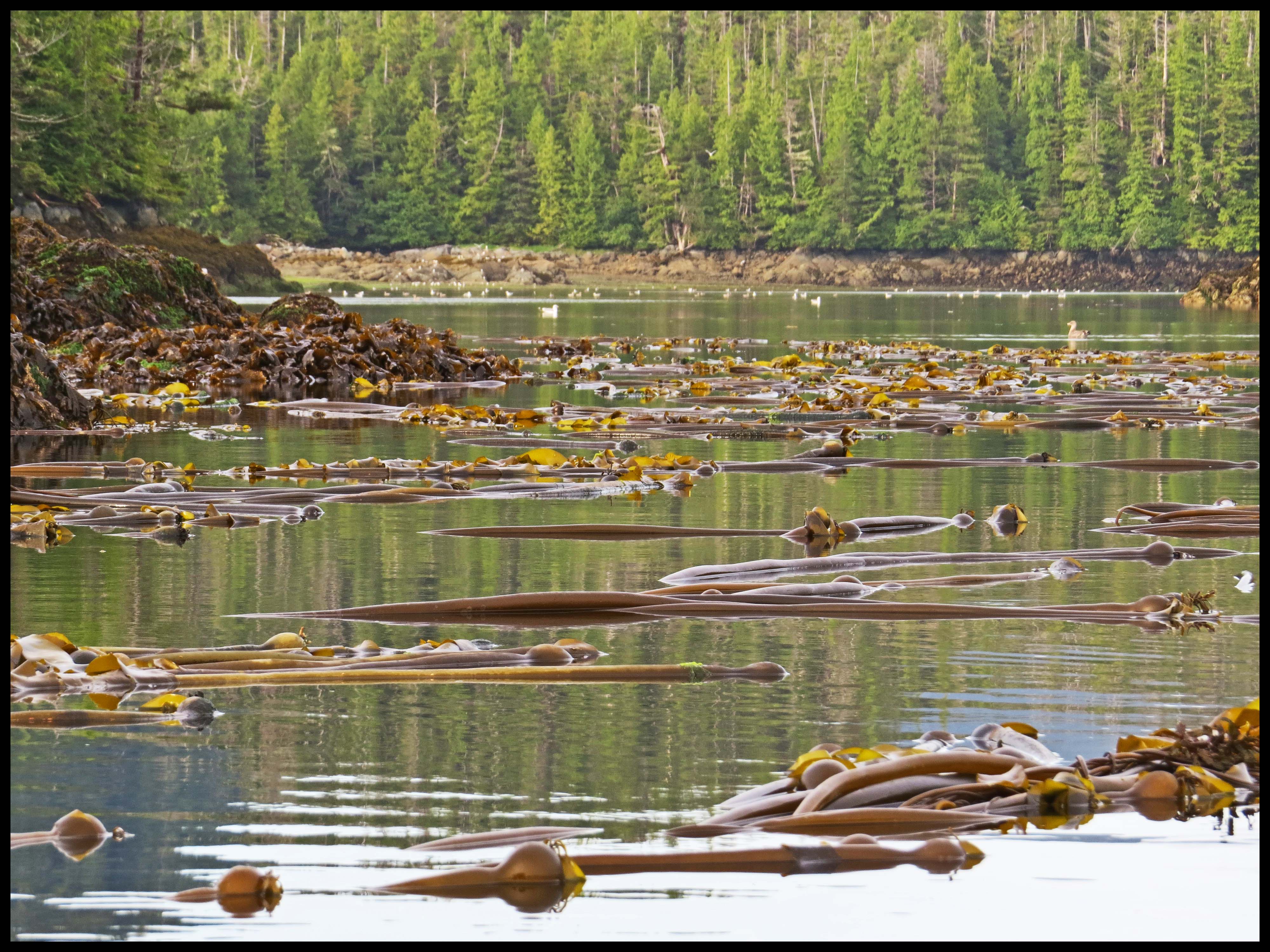 It’s another beautiful summer day, perfect for paddling. The seas are flat calm this morning, so I head out to the entrance to check out the kelp beds. Al’s thinking about trying to get some rock fish for another batch of fish chowder.