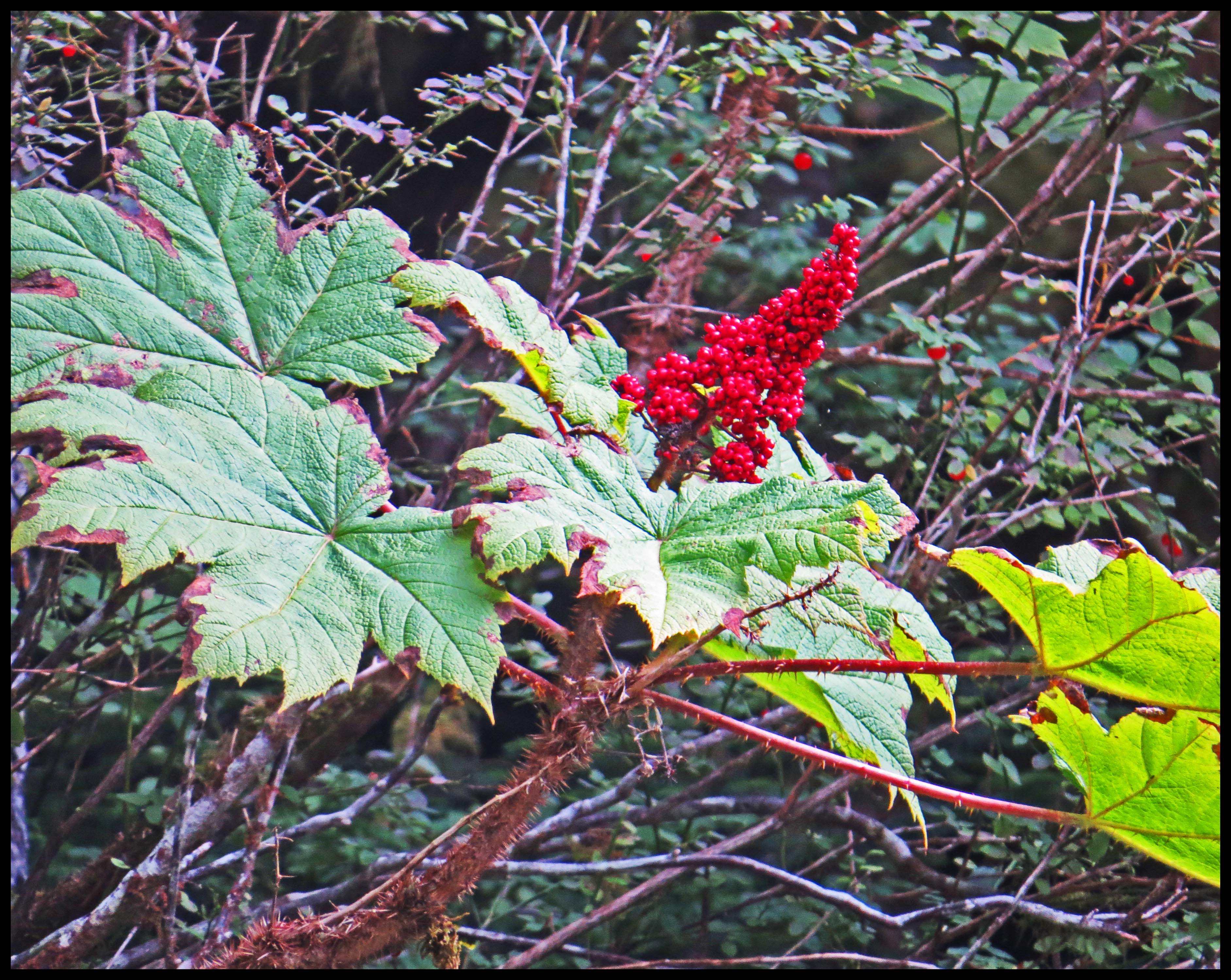 This morning I paddled out the entrance channel, hoping to get some more shots of that eagle, but he never showed. I waited and waited, but there just wasn’t anything to shoot. The tide was still going out, running at about 2 knots. I paddled back and forth for almost an hour, hoping for something to show up that I could photograph. The only thing I saw was this Devil’s Club.