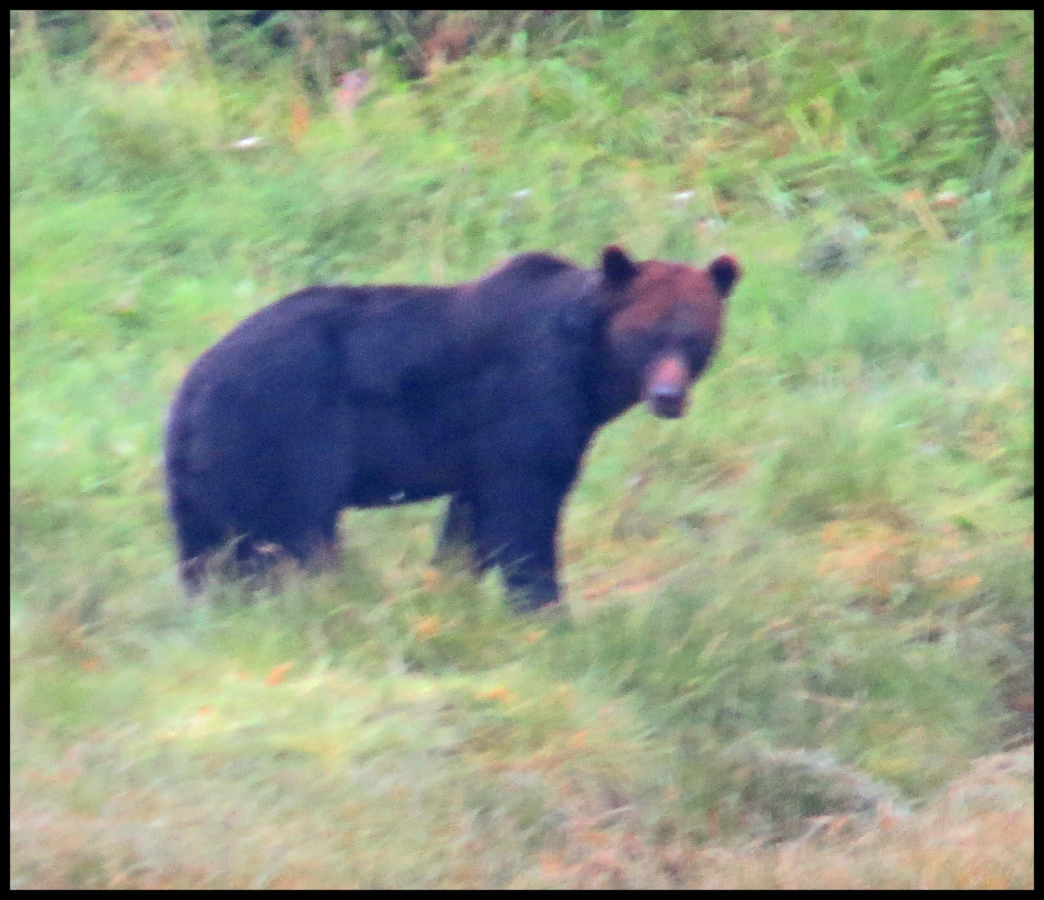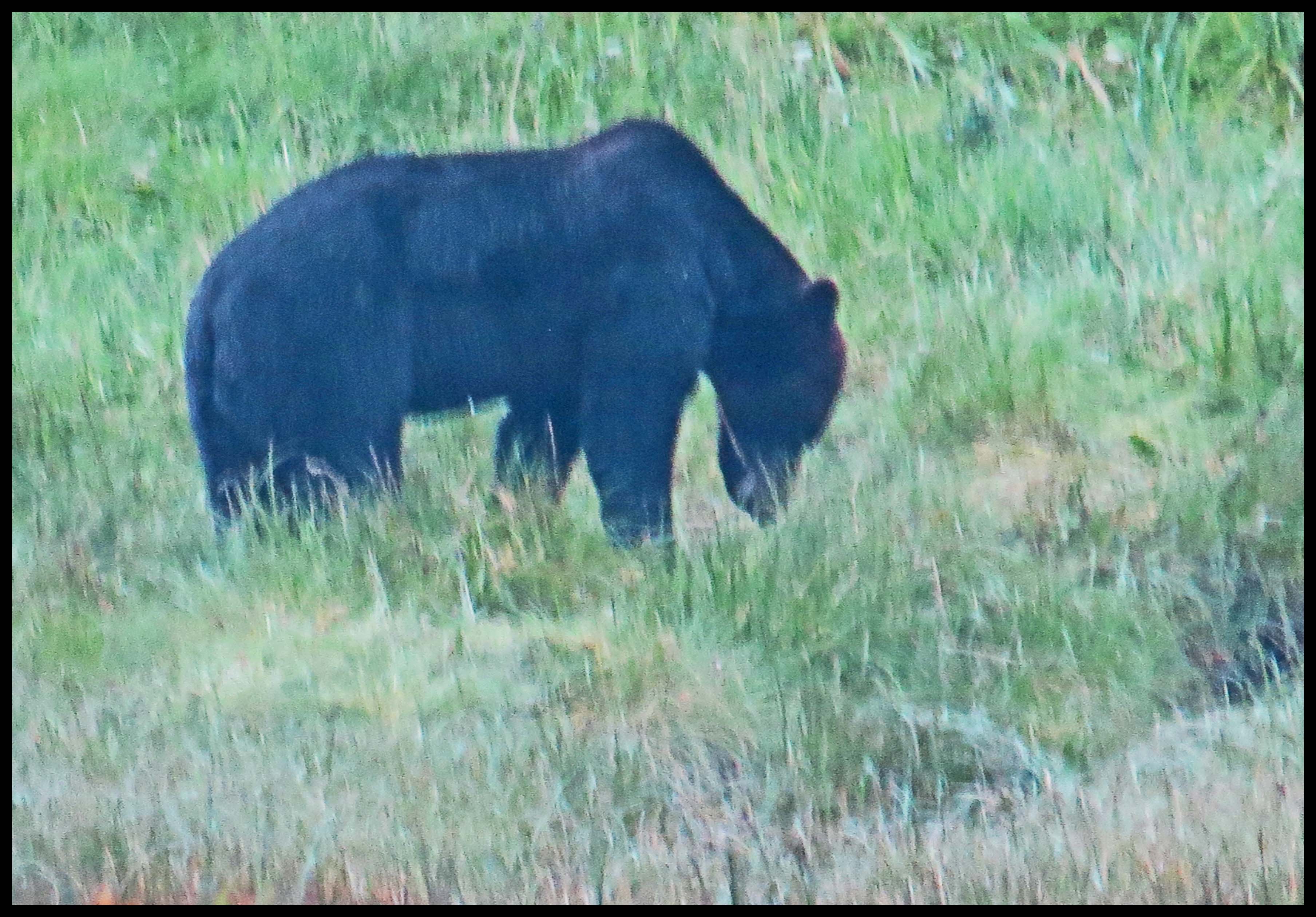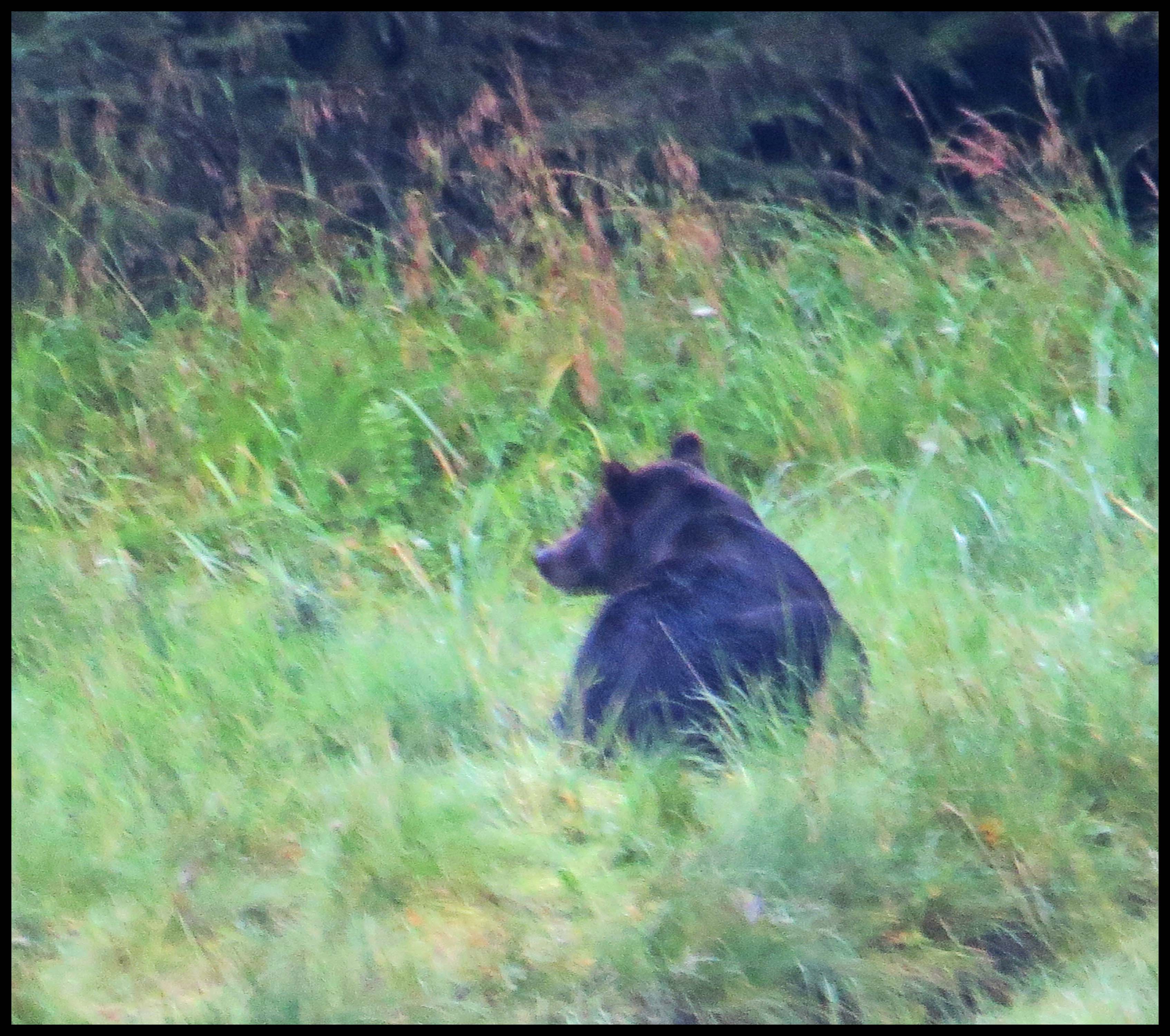He headed for the creek, out of sight behind that darn berm. But, I tried to be patient, making sure I had enough water to float, and wasn’t so close to shore that I might be eaten. After what seemed like an eternity, the bear gave up on fishing and headed for some much easier to acquire grass.