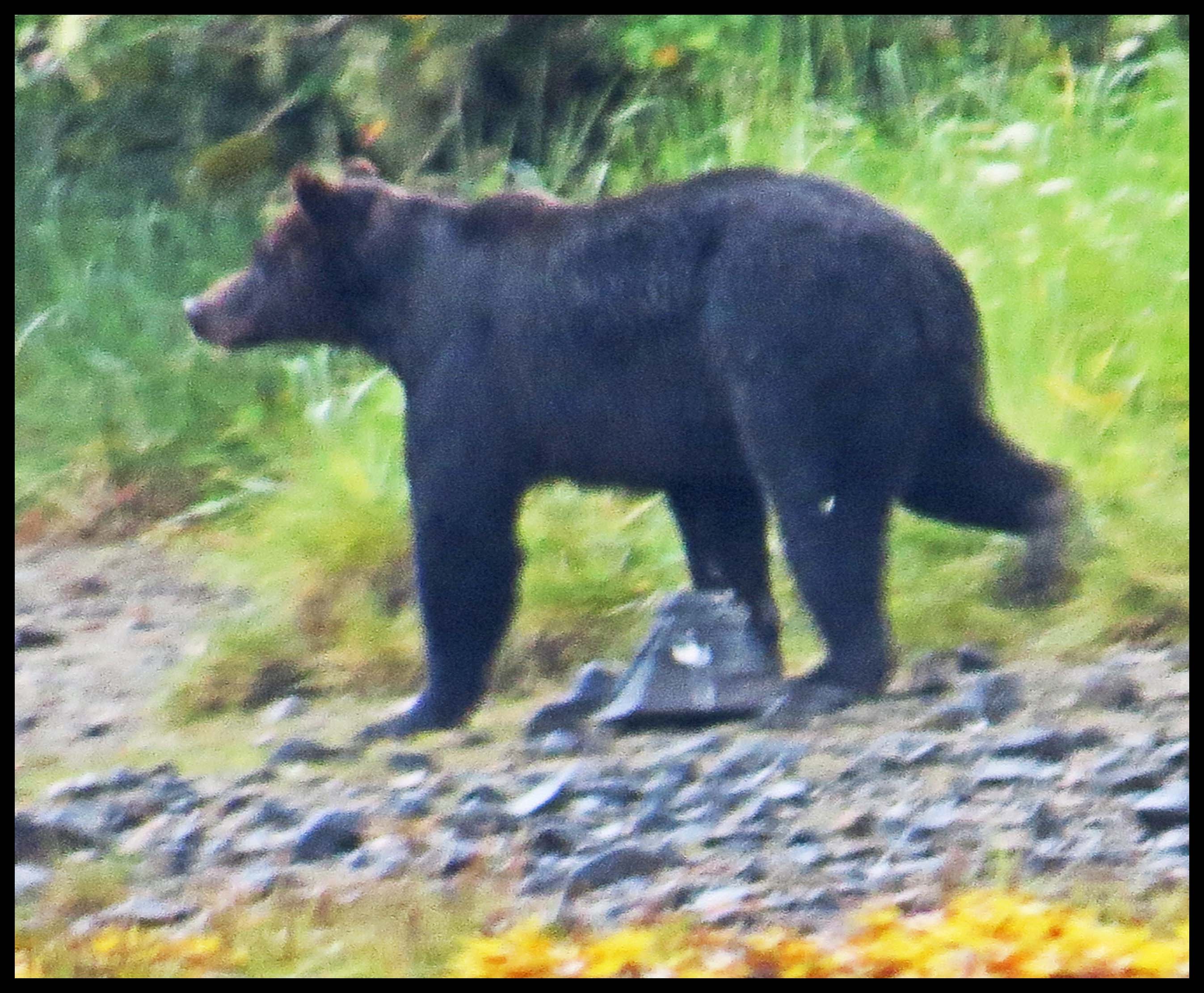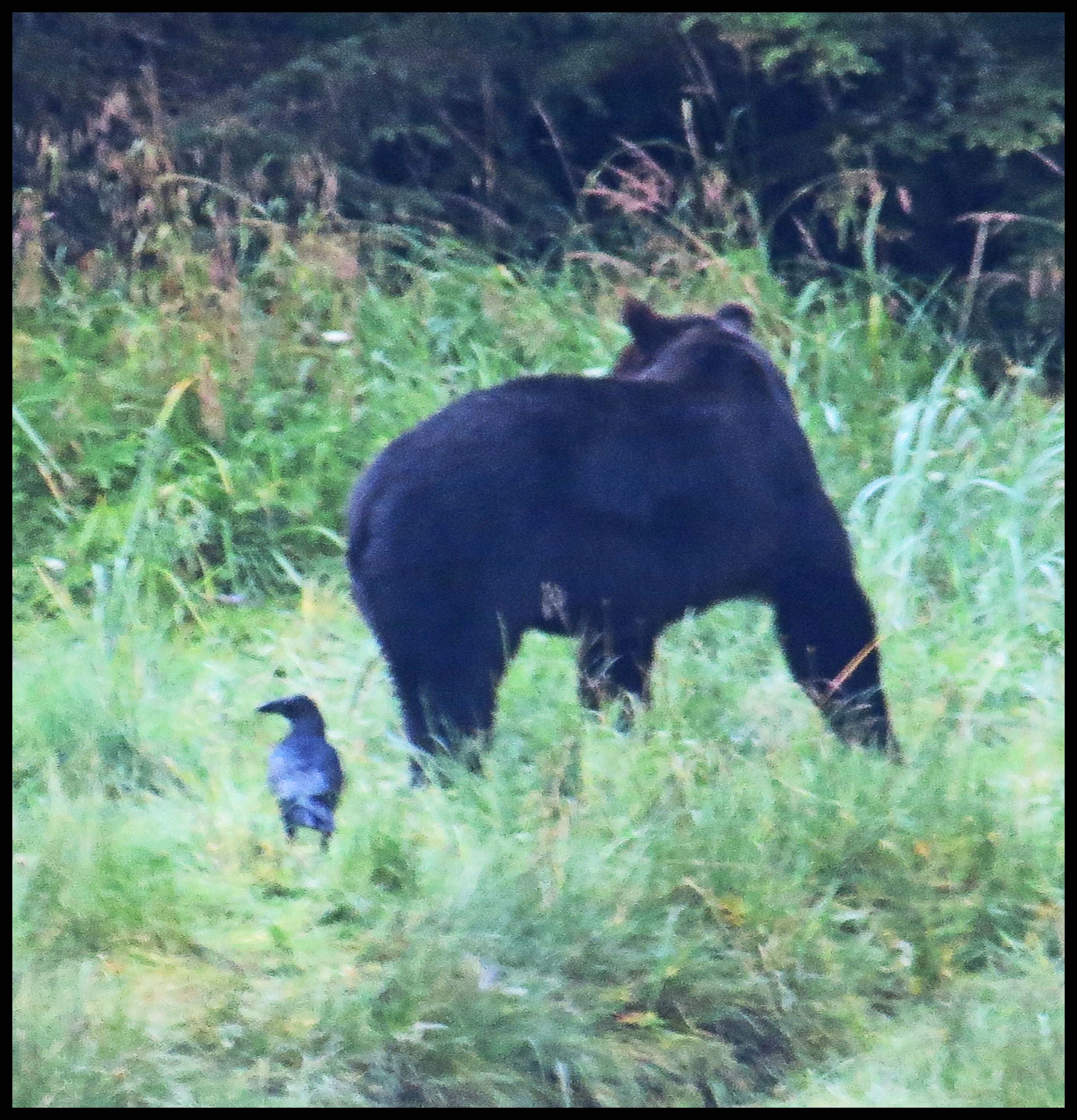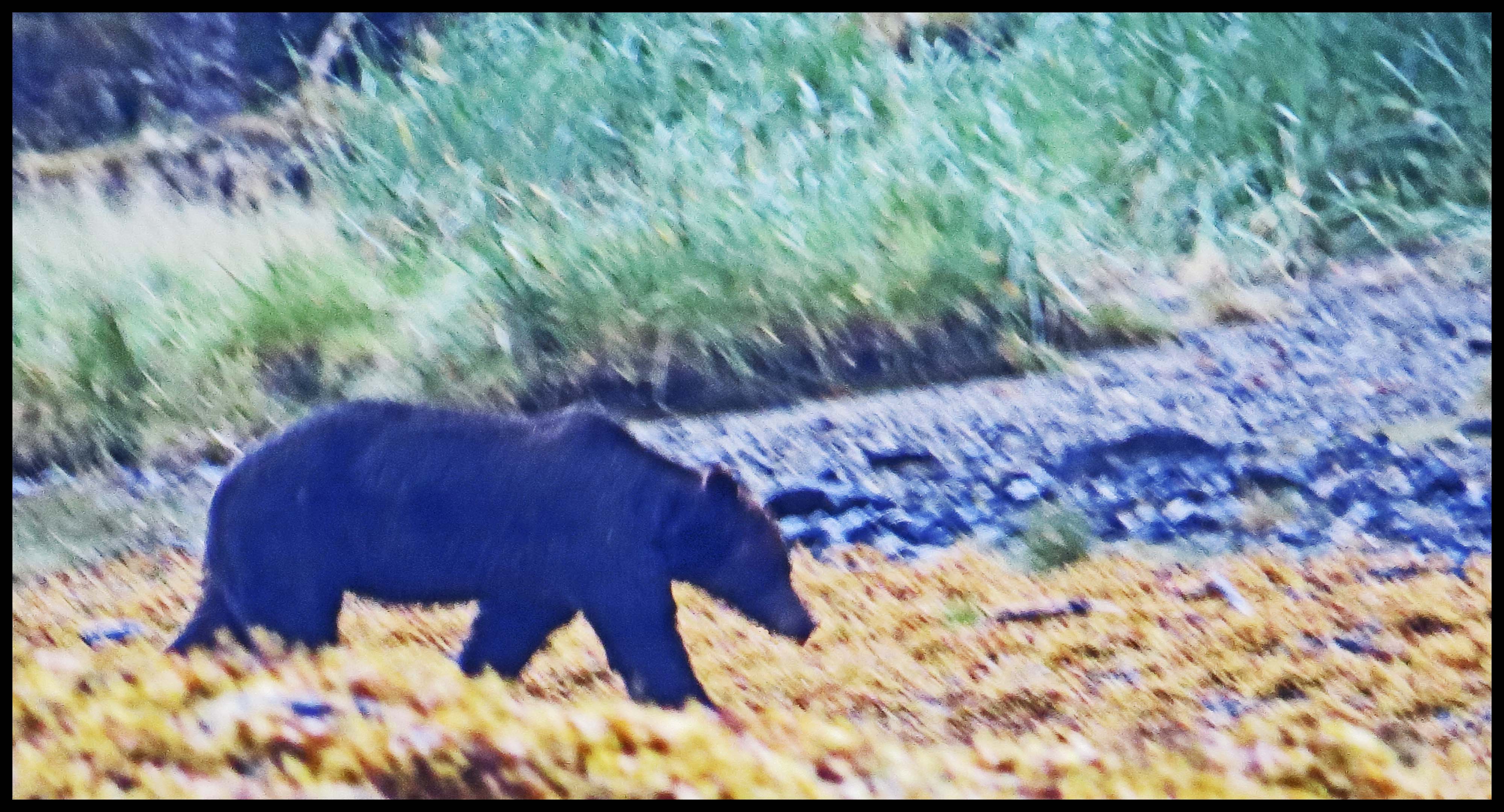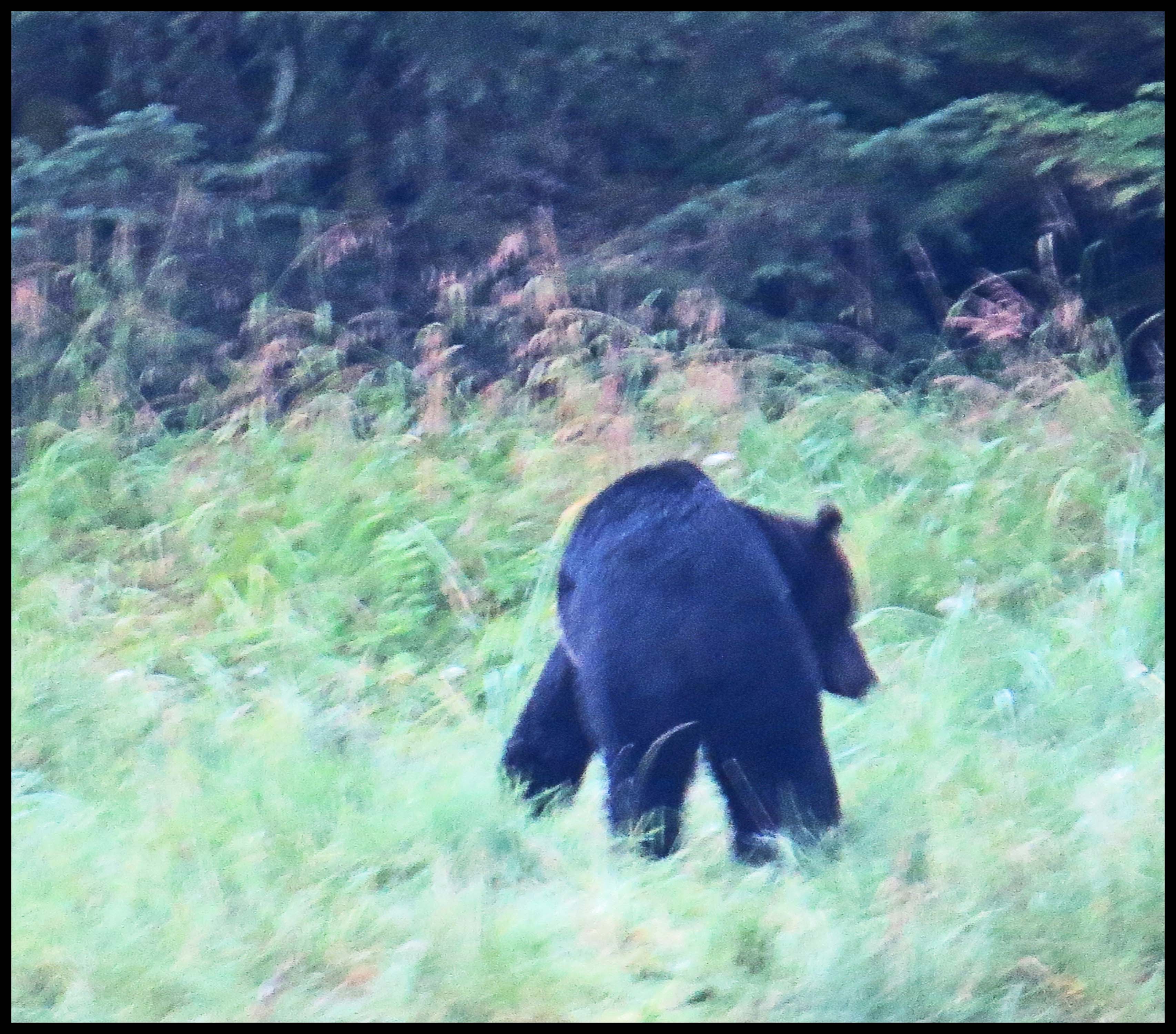 He headed for the creek, out of sight behind that darn berm. But, I tried to be patient, making sure I had enough water to float, and wasn’t so close to shore that I might be eaten. After what seemed like an eternity, the bear gave up on fishing and headed for some much easier to acquire grass.
