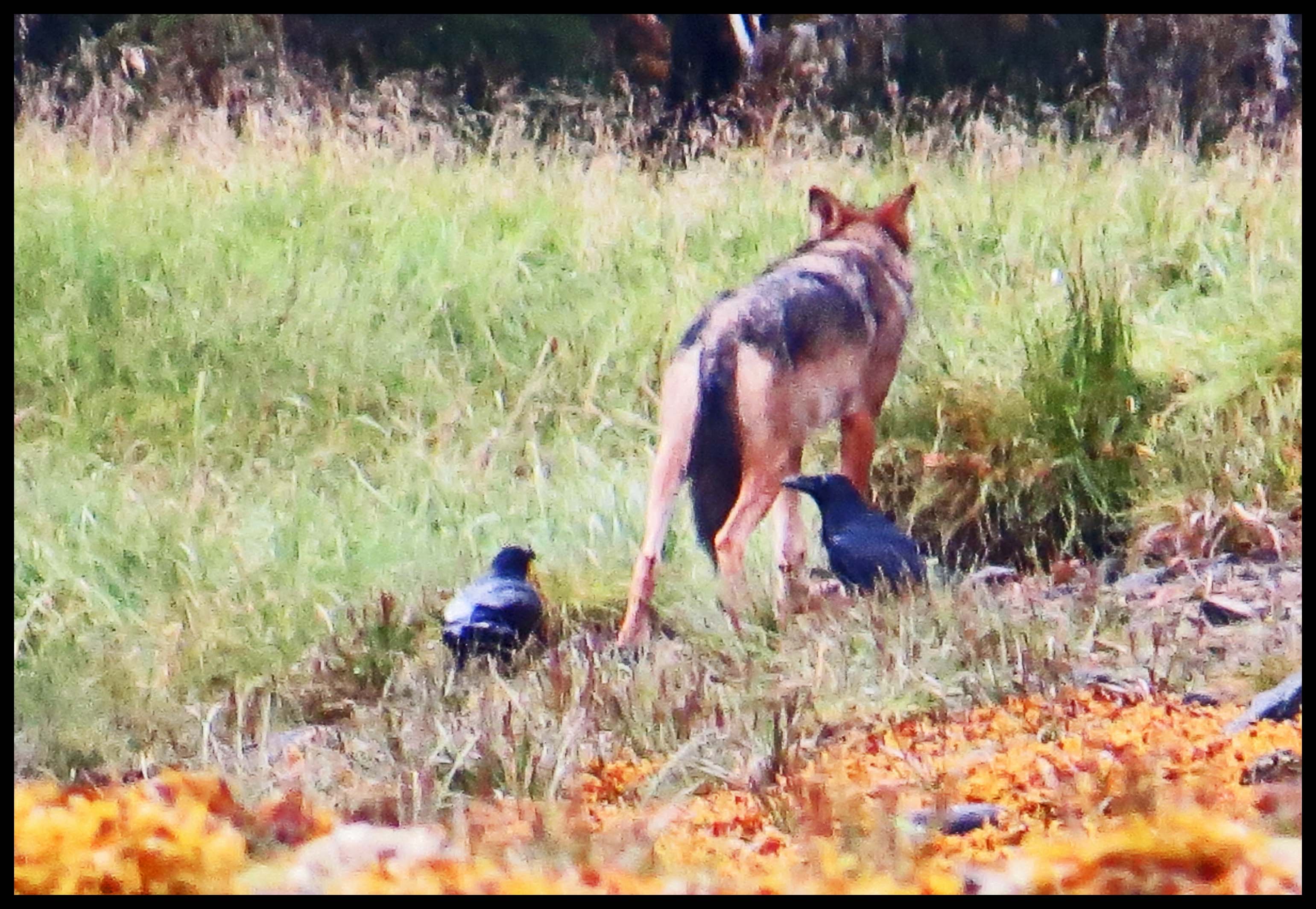The crows didn’t like Mr. Wolf one bit, and got right in his face, cawing up a storm.