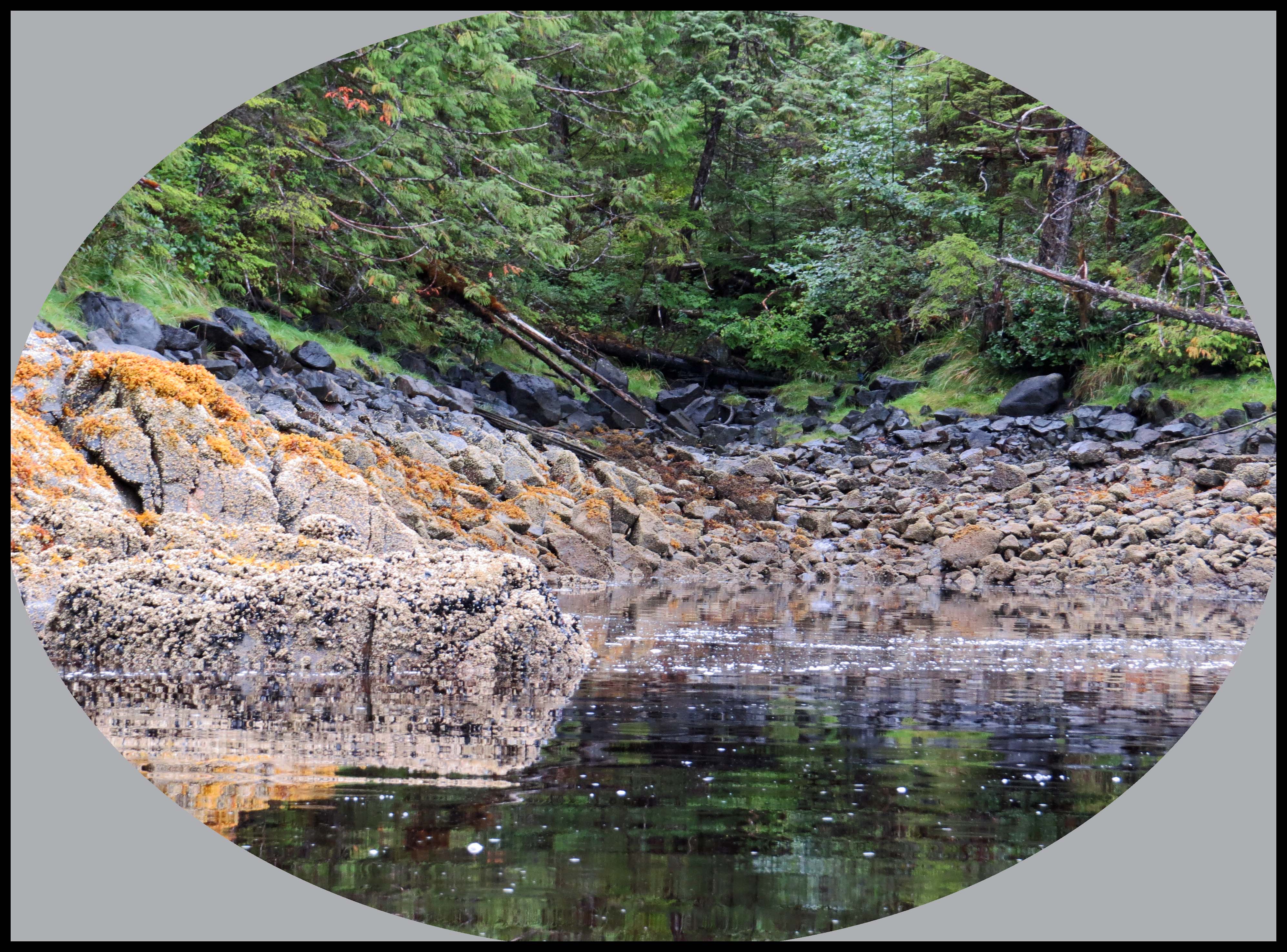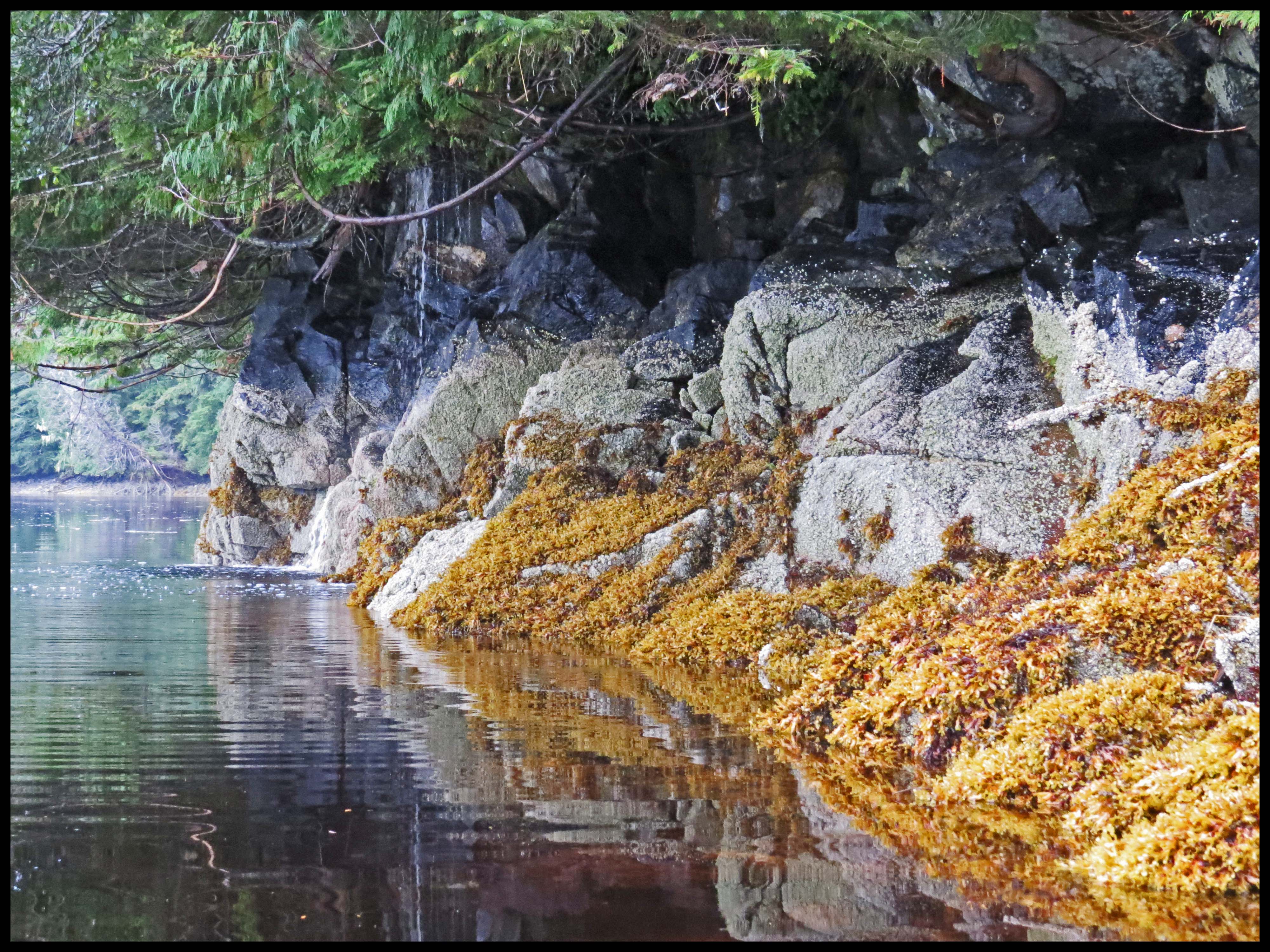 After four days, the rain lightened to sprinkles, and the wind dropped to 10 to 15 knots. So, I suited up for a paddle around Kiln. First, I headed for the creek at the head of Kiln.