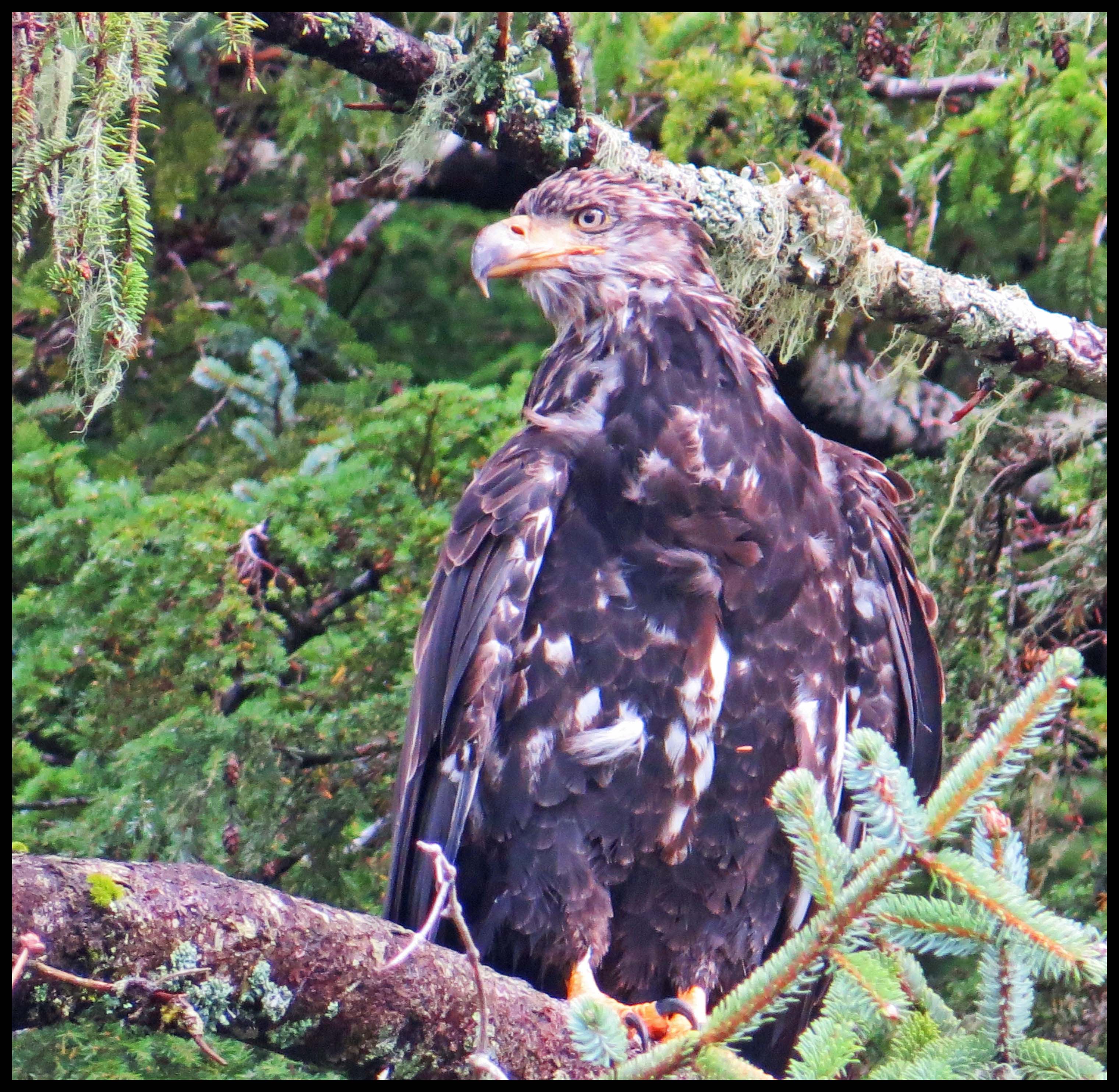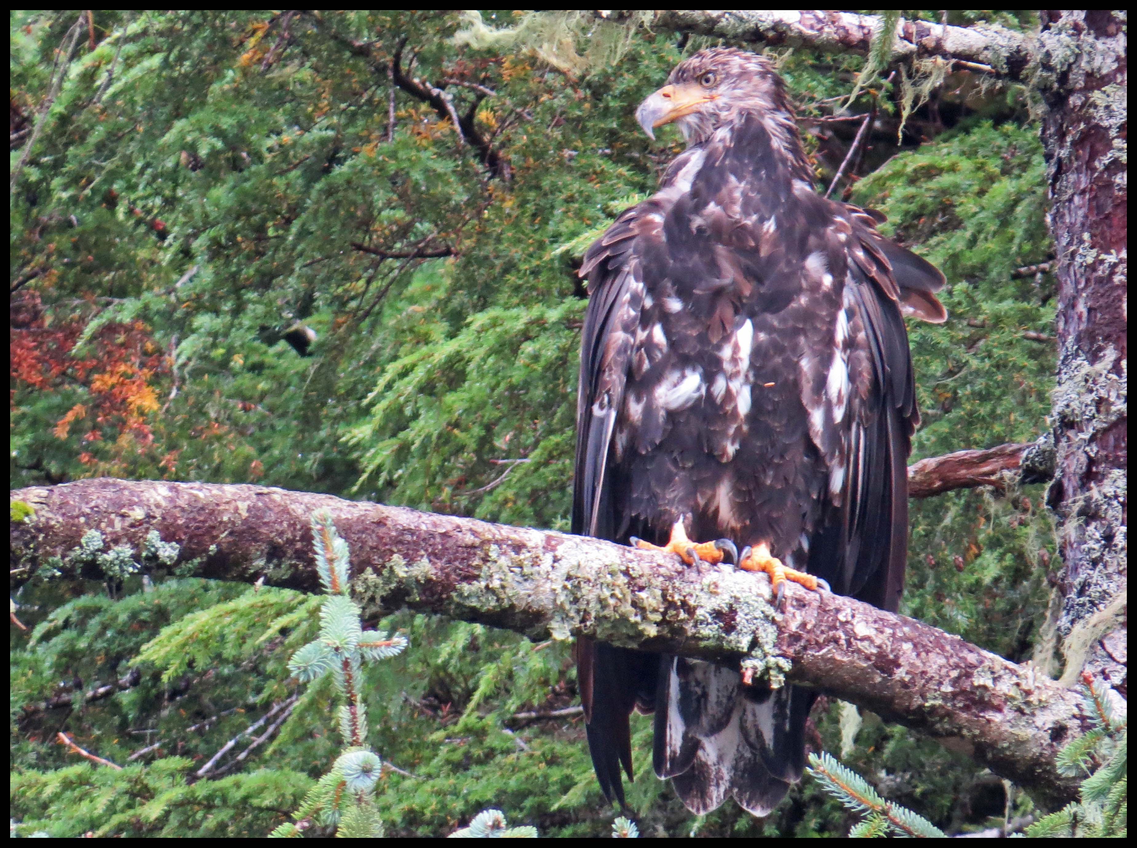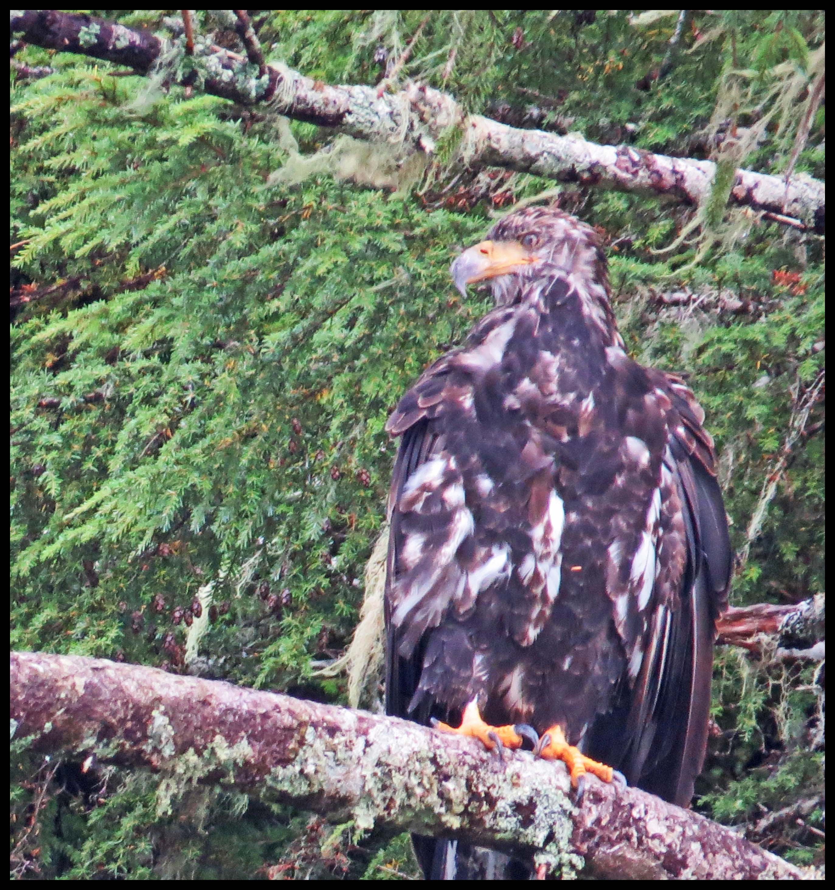I spotted this immature eagle looking for salmon working their way up the creek. Sadly, the salmon just haven’t shown up in the usual numbers. And, the salmon we’ve seen have been small.