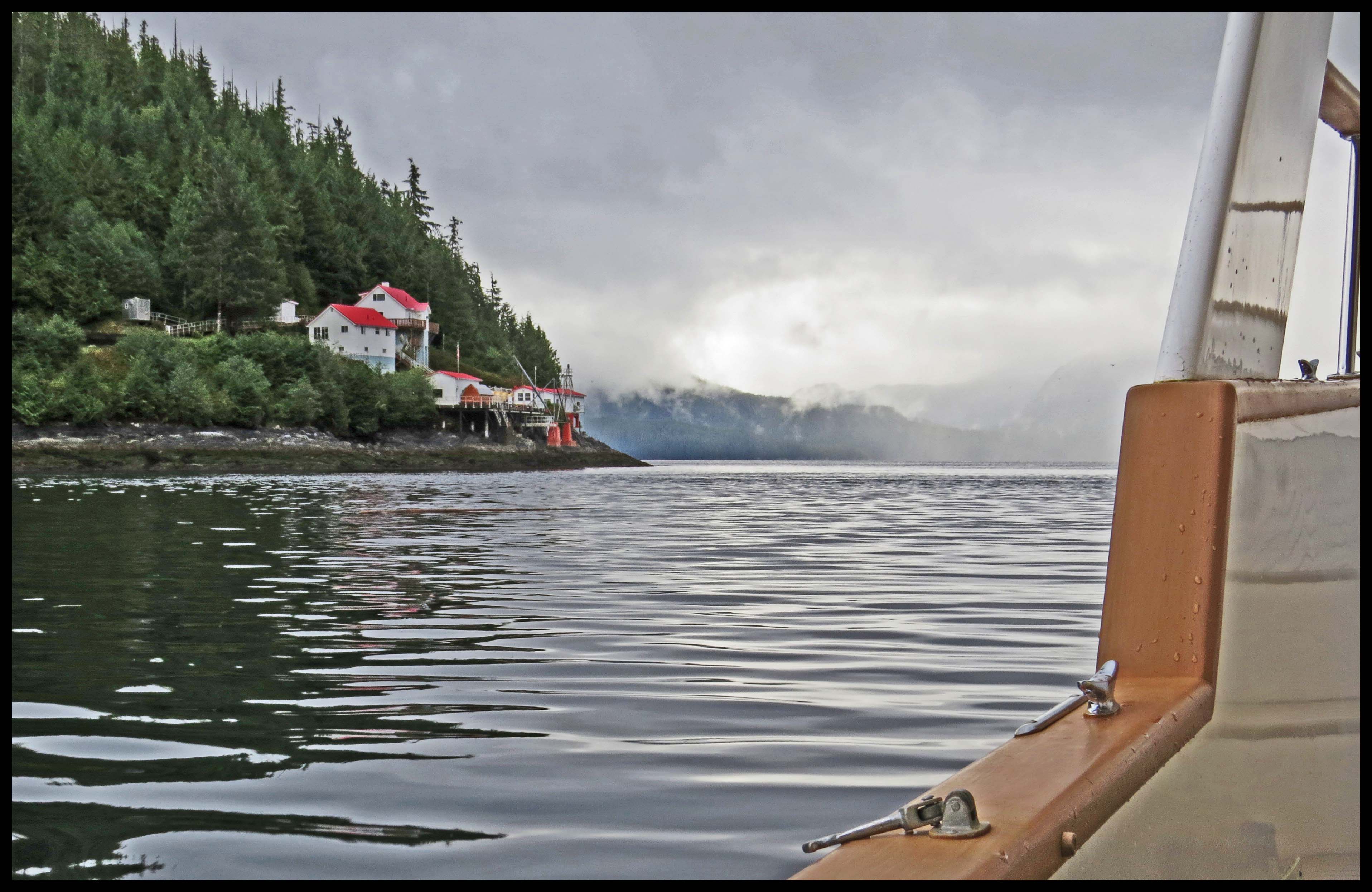 We don’t have far to go today, and we’ll be in protected waters. Yay! It’s rainingwhen we leave, but there’s no wind to speak of. The skies are rather ominous as we reach Boat Bluff.